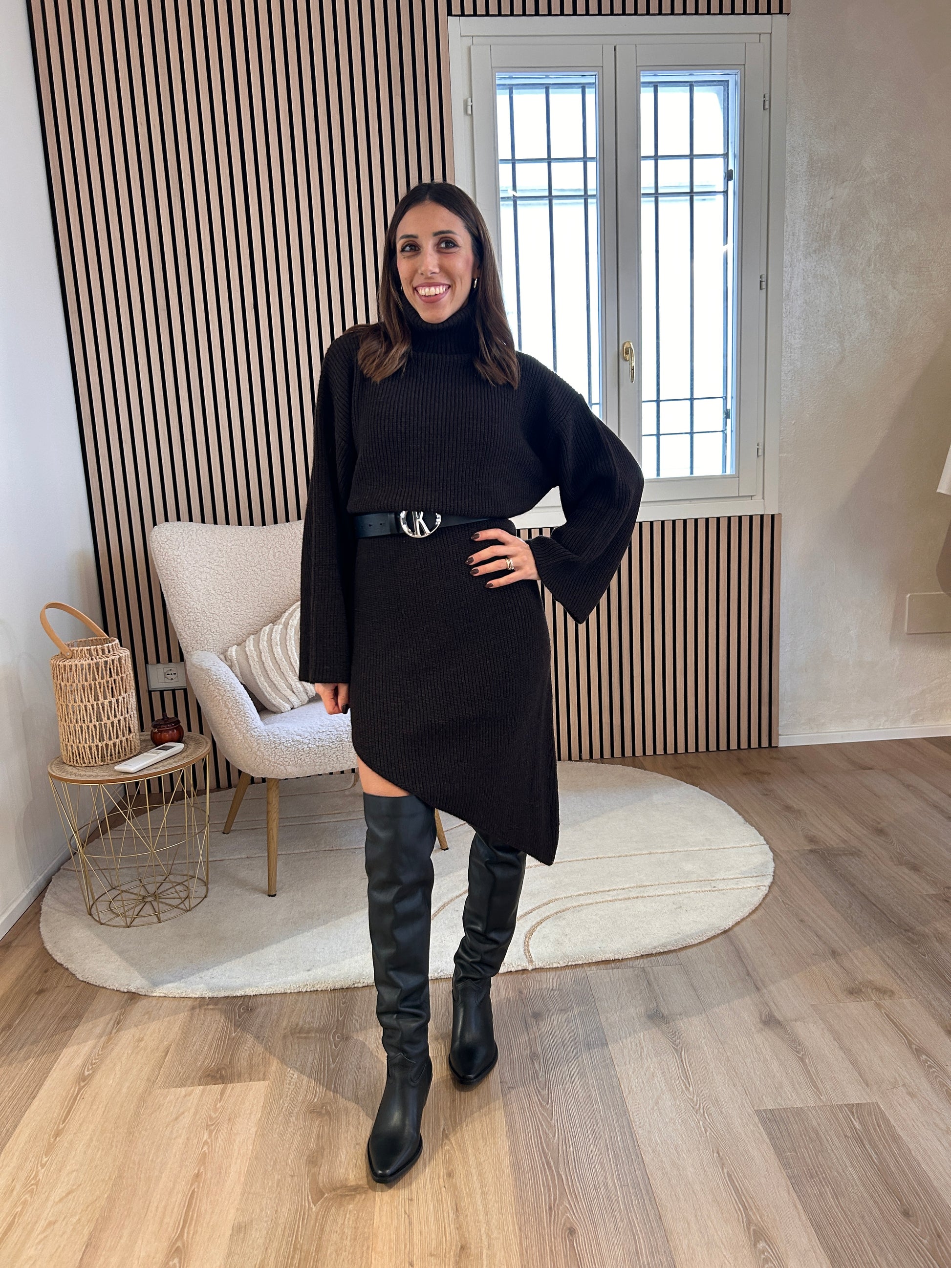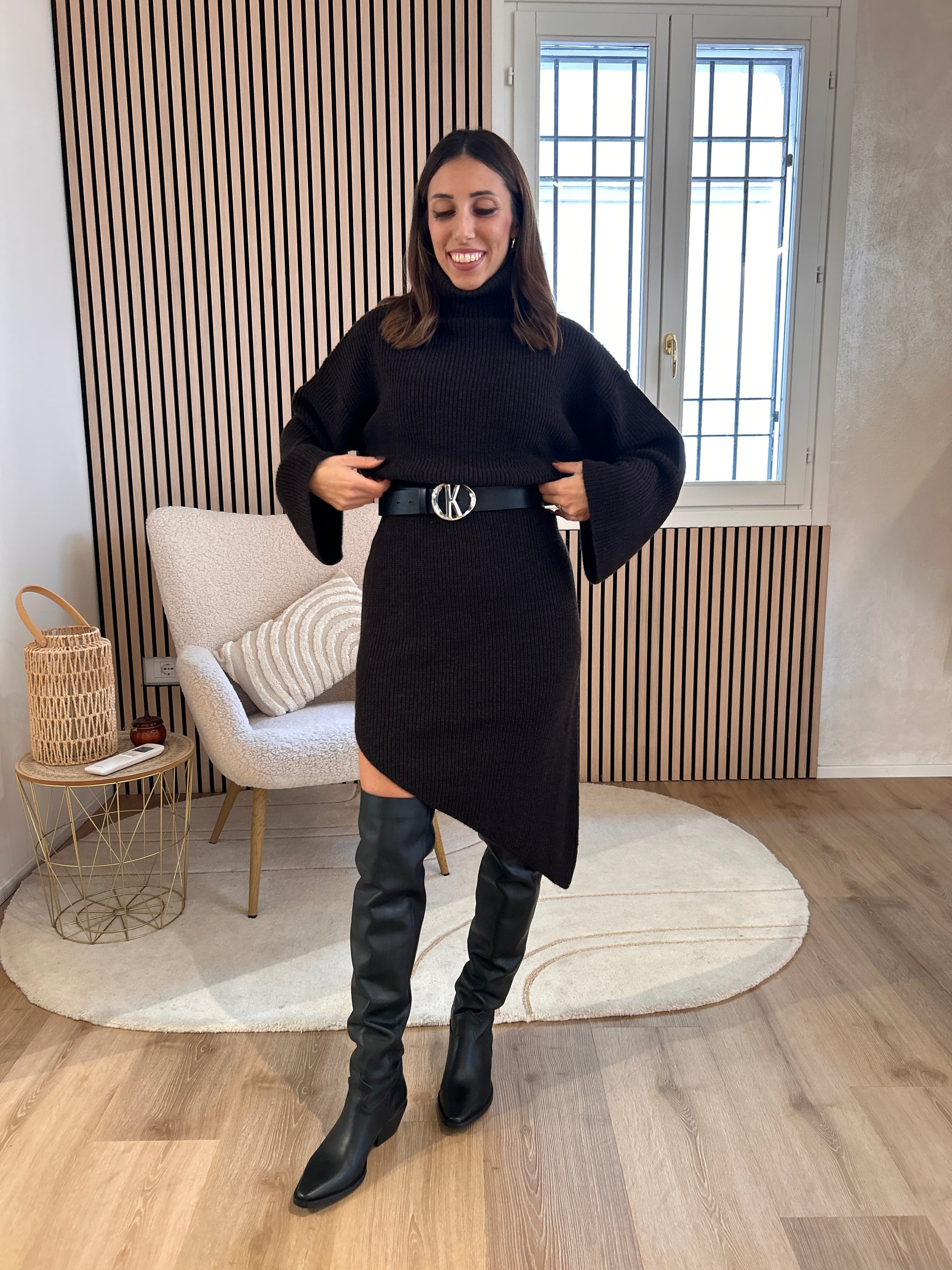 Questo abito dolcevita asimmetrico moro è il capo che stavi cercando per sorprendere. Il collo dolcevita classico si incontra con un taglio asimmetrico audace che crea movimento e personalità. Perfetto per chi osa osare con stile, trasforma ogni occasione in un'opportunità per brillare.