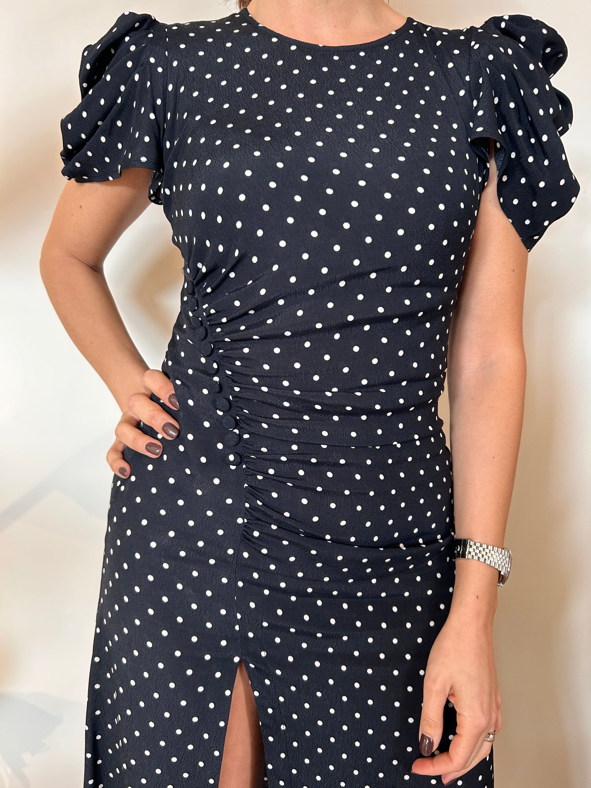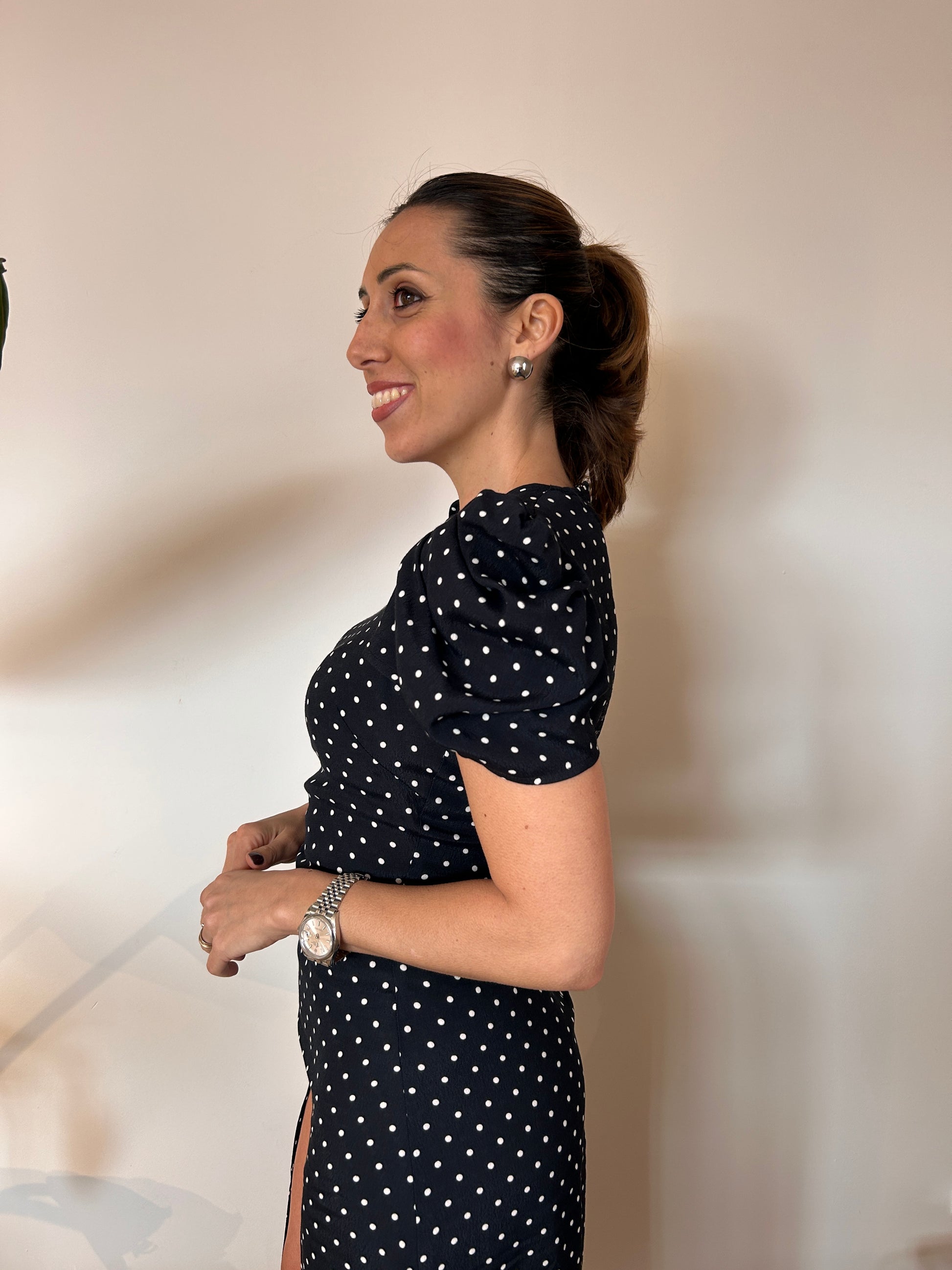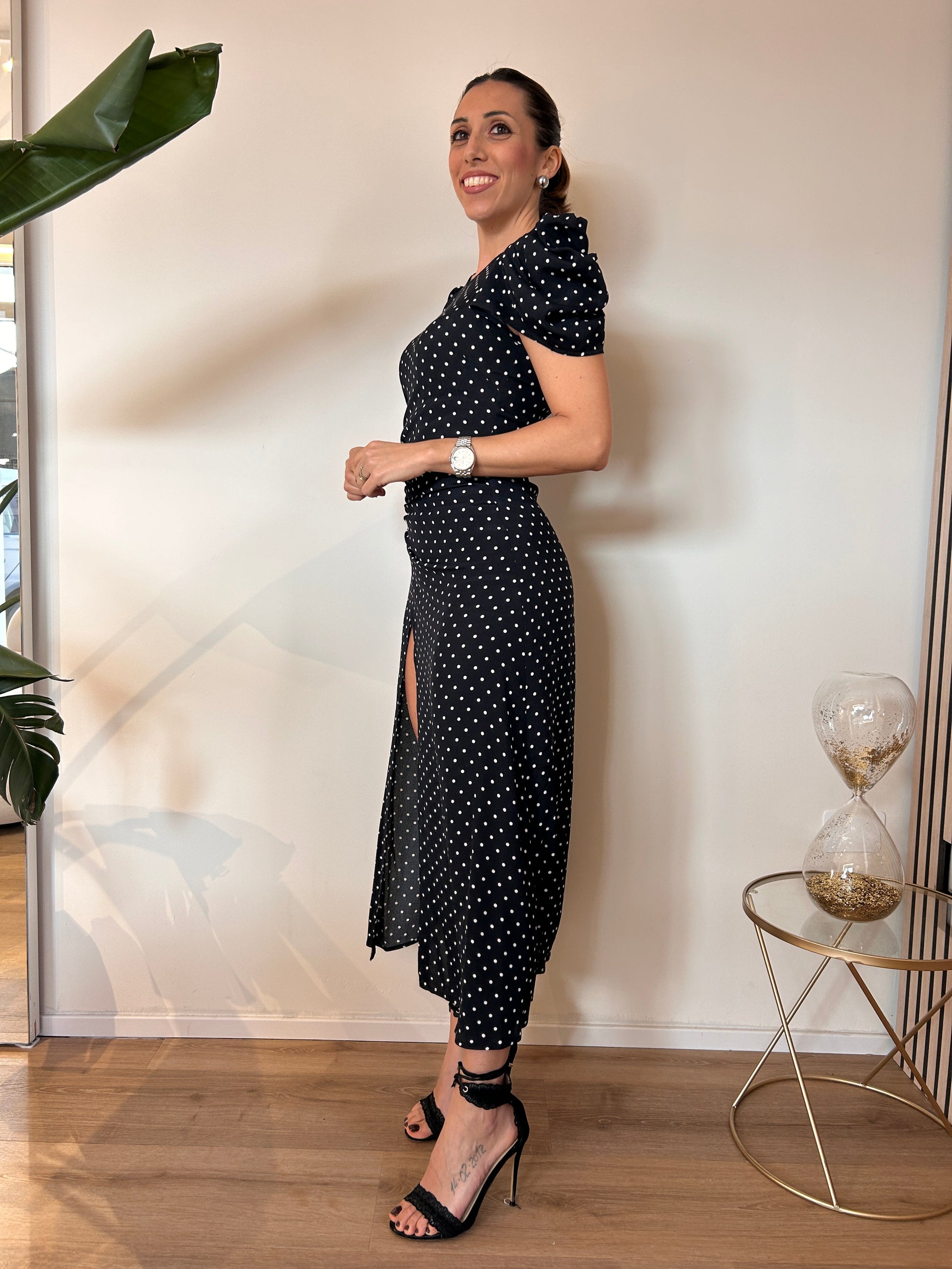 Abito Kristel di Mar de Margaritas , midi, in crepe con drappeggio e bottoncini, con spacco laterale. Fantasia petitpois nero. Vestibilità regolare dalla XS alla L.