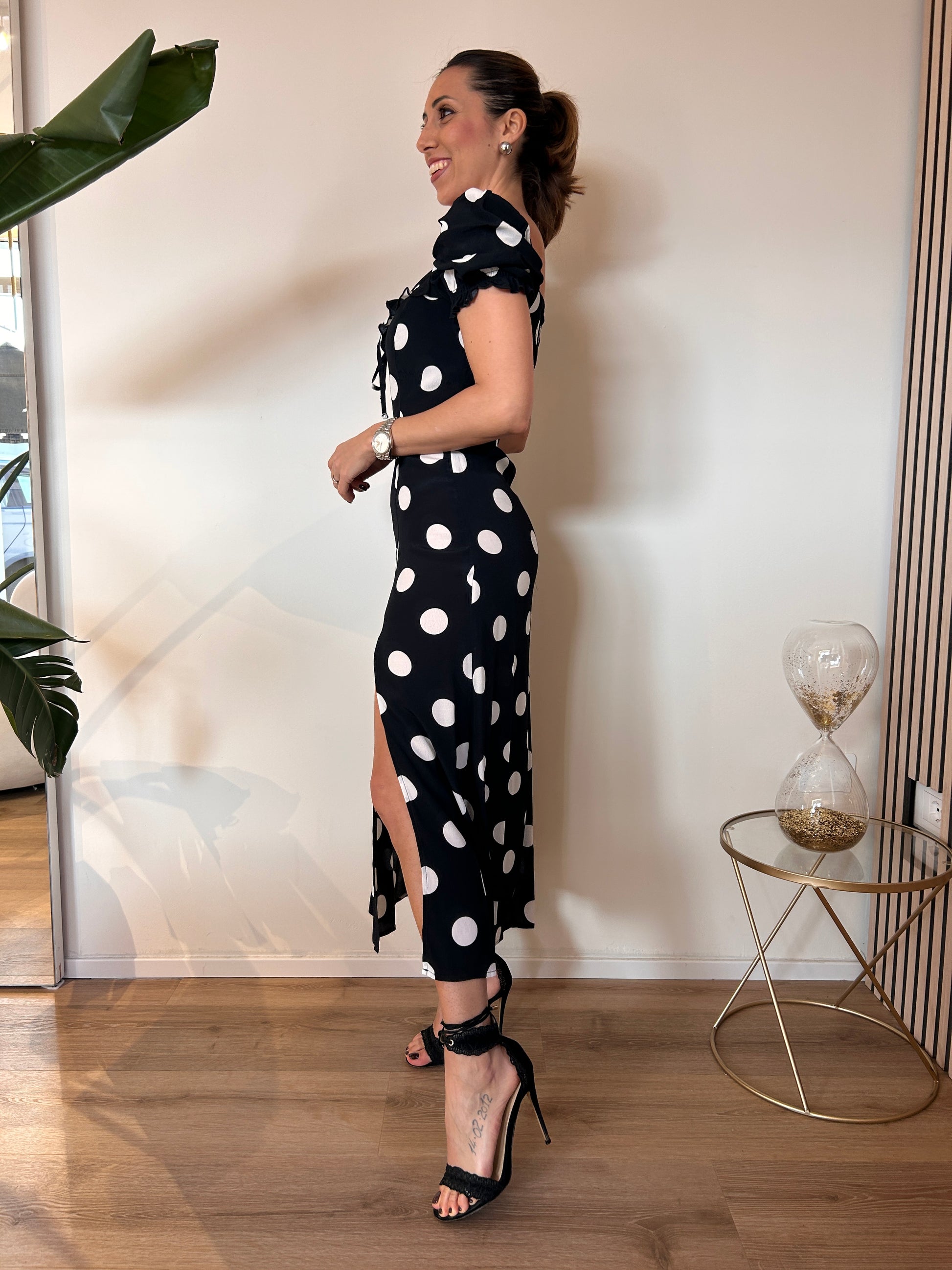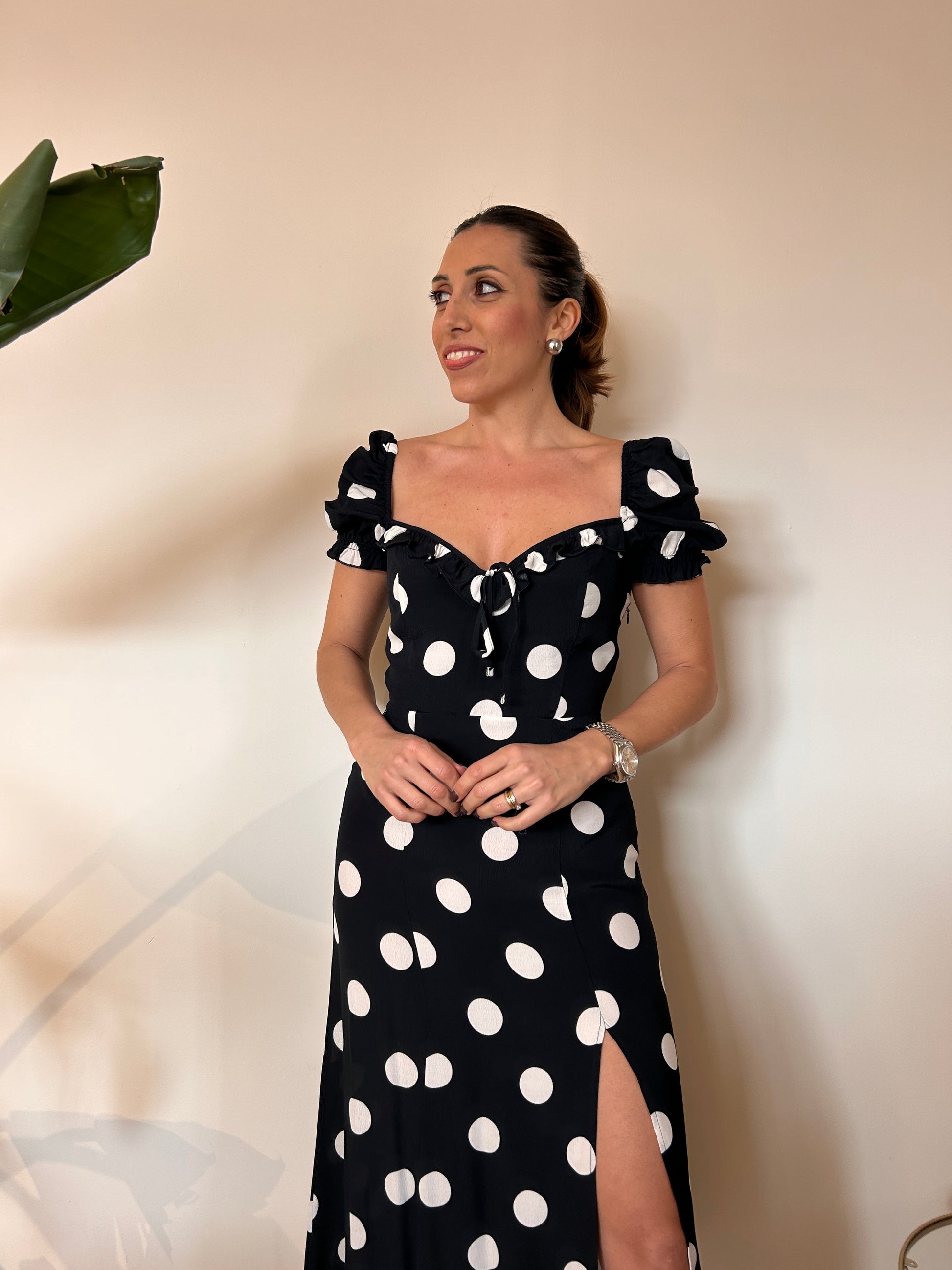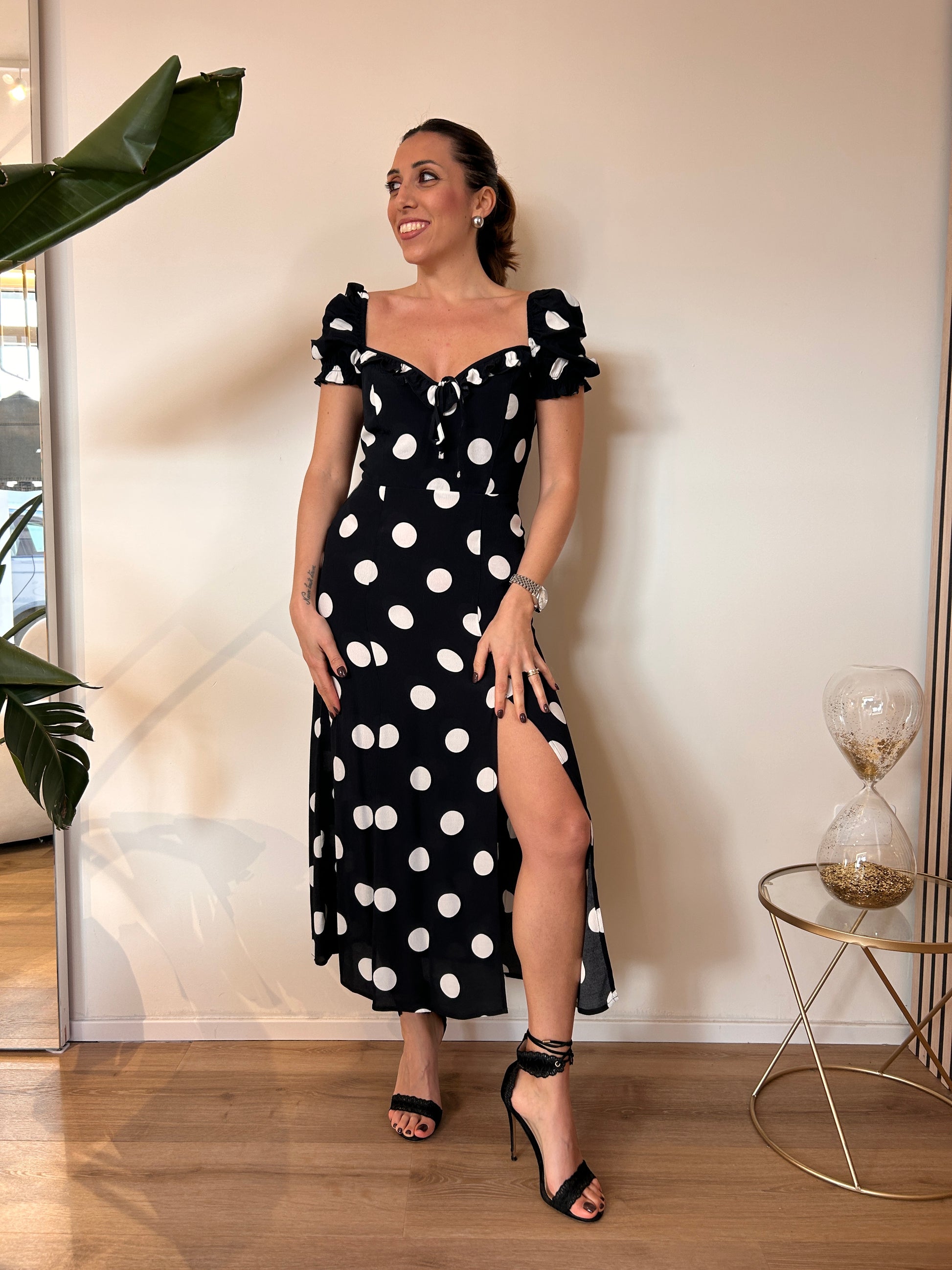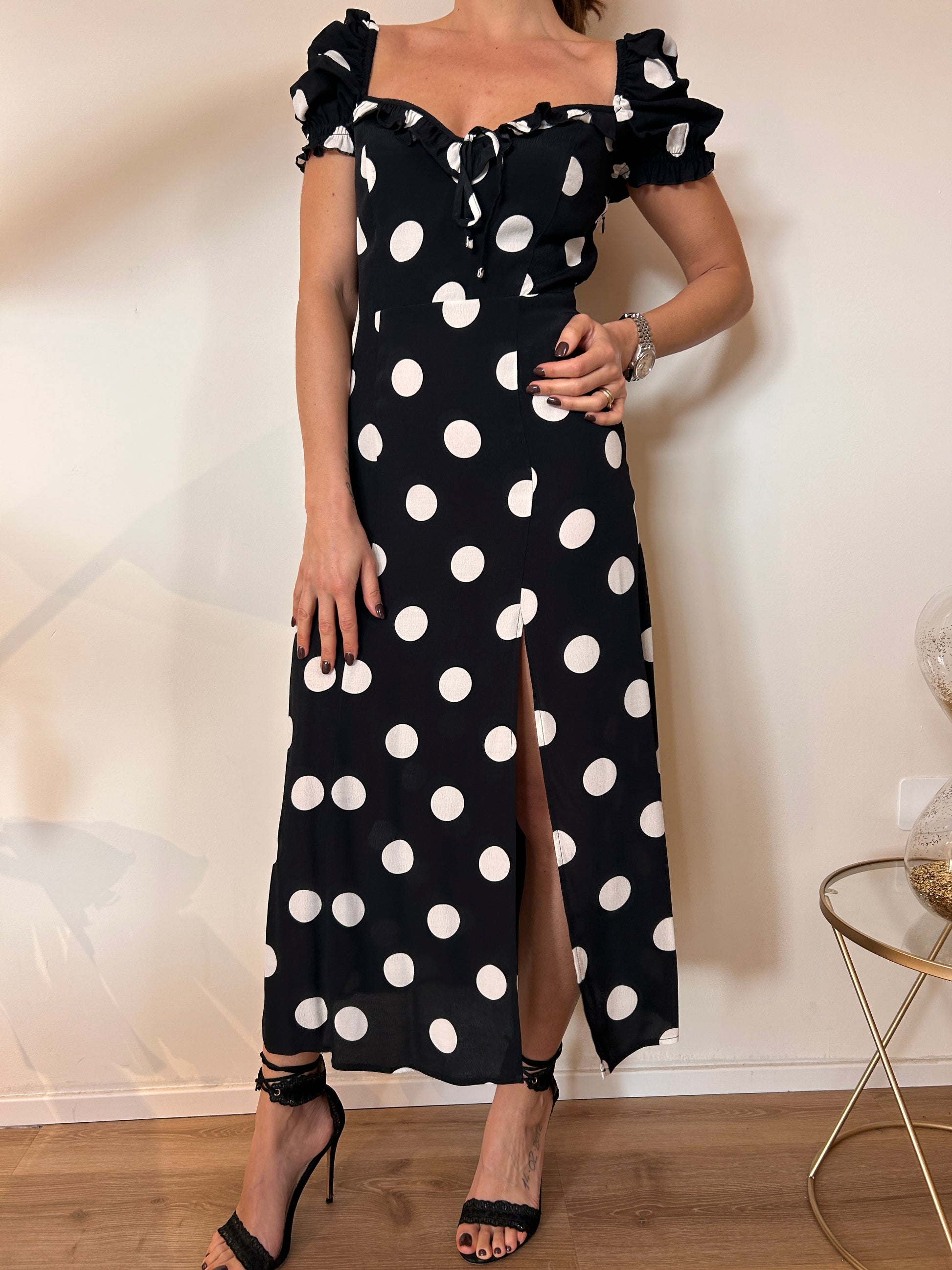 Abito Nikita di Mar de Margaritas , midi , in crepe a mezza manica con volant sullo scollo. Fantasia pois grande nero. Vestibilità regolare dalla XS alla L.