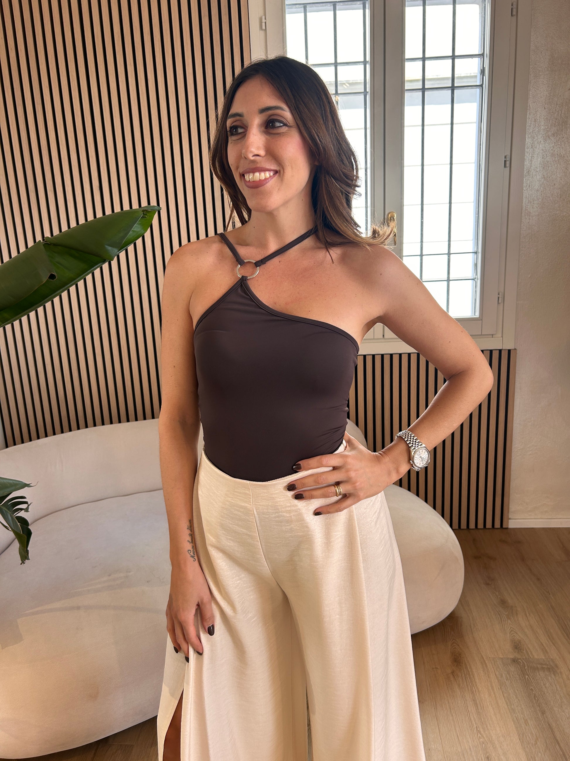 Body di Haveone, nel color moro con spalline oblique ed anello. Vestibilità regolare dalla S alla M.