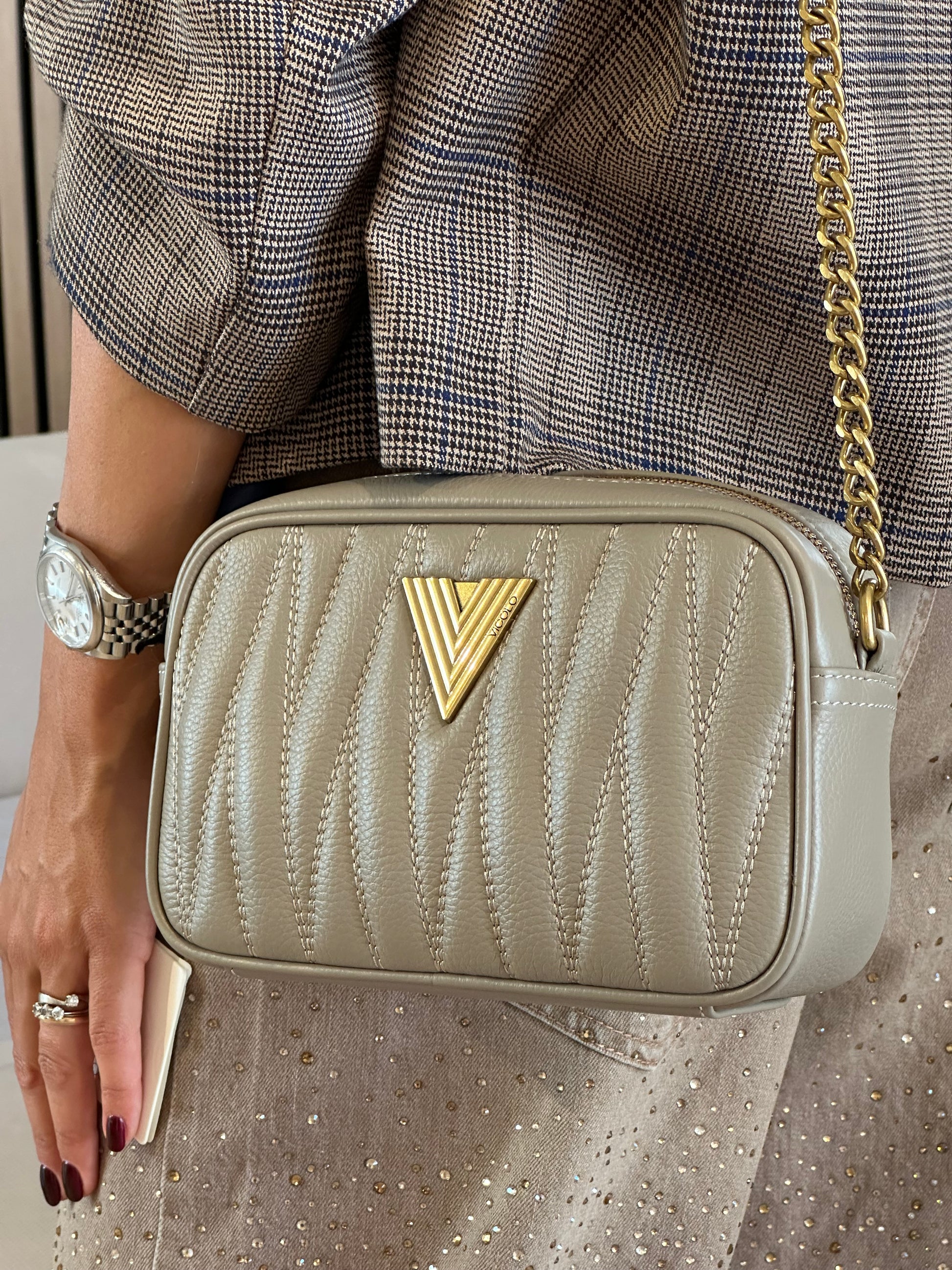 Borsa Soho a tracolla in pelle trapuntata. Chiusura con cerniera e tiralampo. Dettaglio fibbia V metalplate Vicolo. Tracolla con catena e pelle. La borsa può essere indossata sia come borsa a spalla che come borsa a tracolla. Dettaglio finiture anticate color oro. Tasca interna con cerniera e taschina piatta. Dettaglio charms removibili Vicolo in metallo composti da tre pendenti in fantasia con strass e smalti con catena.