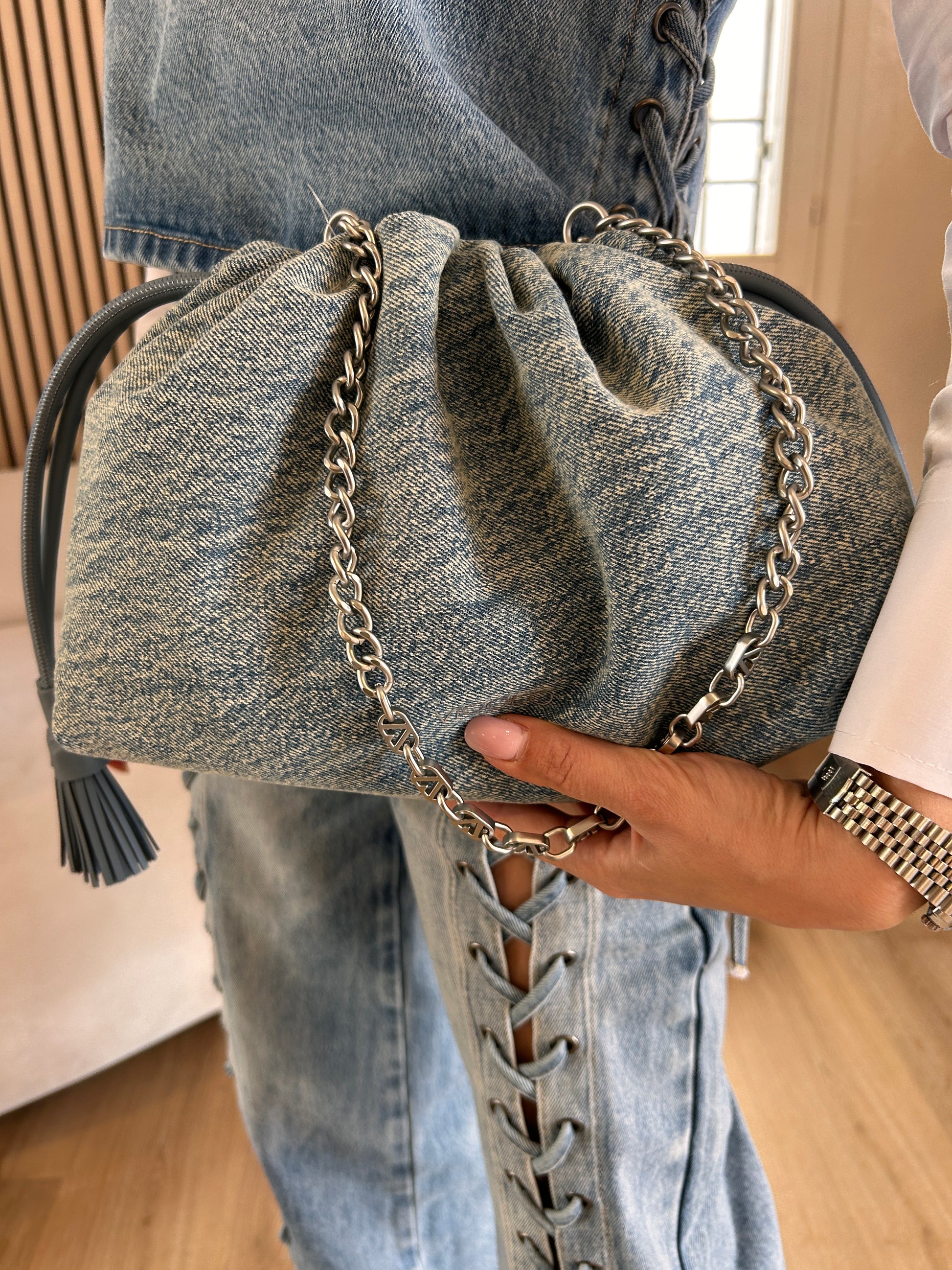 Borsa Tasselbag in denim a spalla. Dettaglio rouches sul bordo. Chiusura con bottone a pressione con calamita e coulisse in ecopelle con nappine. Dettaglio tracolla catena V metal plate Vicolo removibile. Tasca interna con cerniera e taschina piatta.