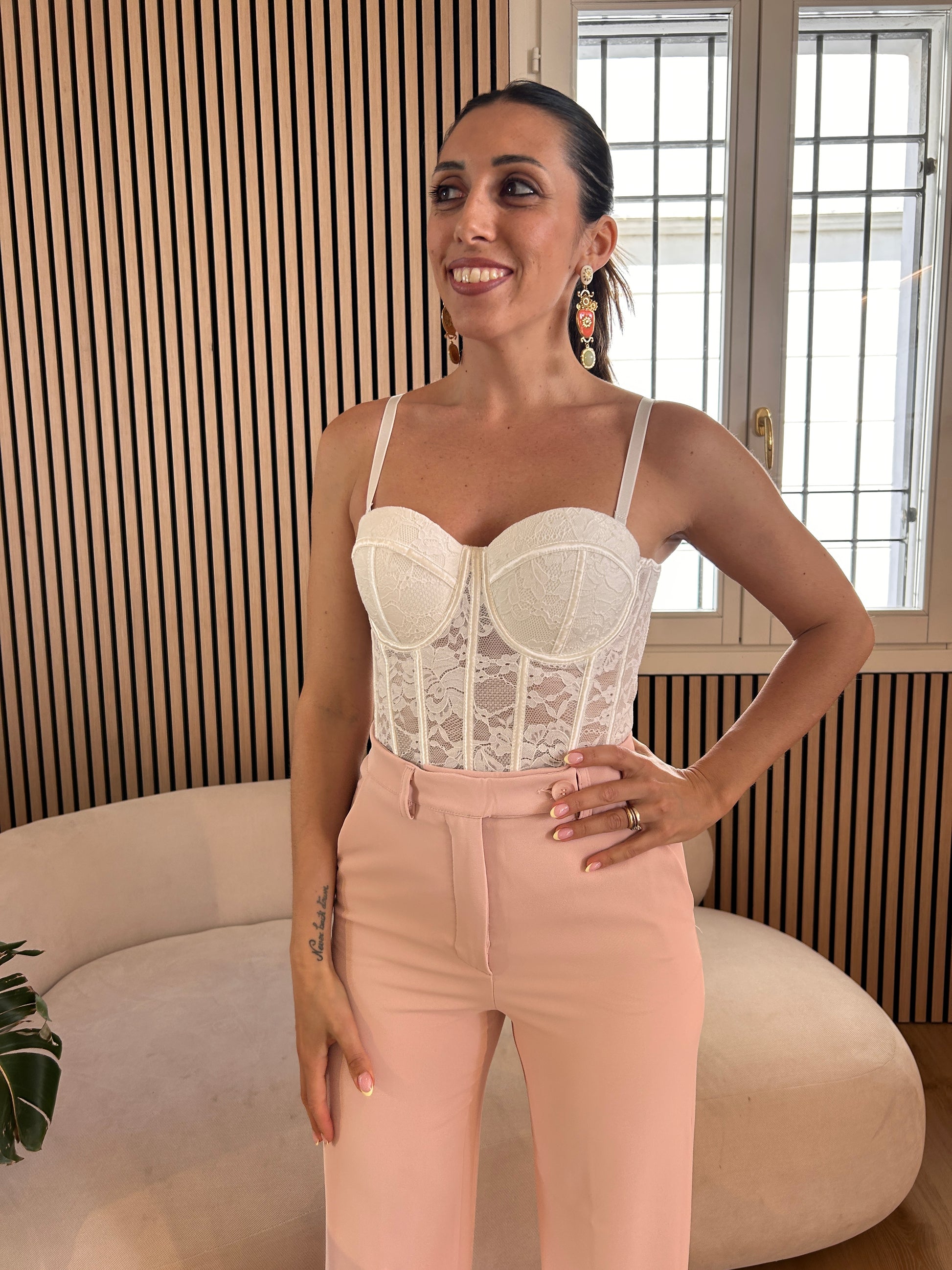 Bustino in pizzo color bianco di Haveone, con stecche sul davanti, coppa imbottita e spalline regolabili con la possibilità di toglierle. Modello lunghezza basic,non crop.
