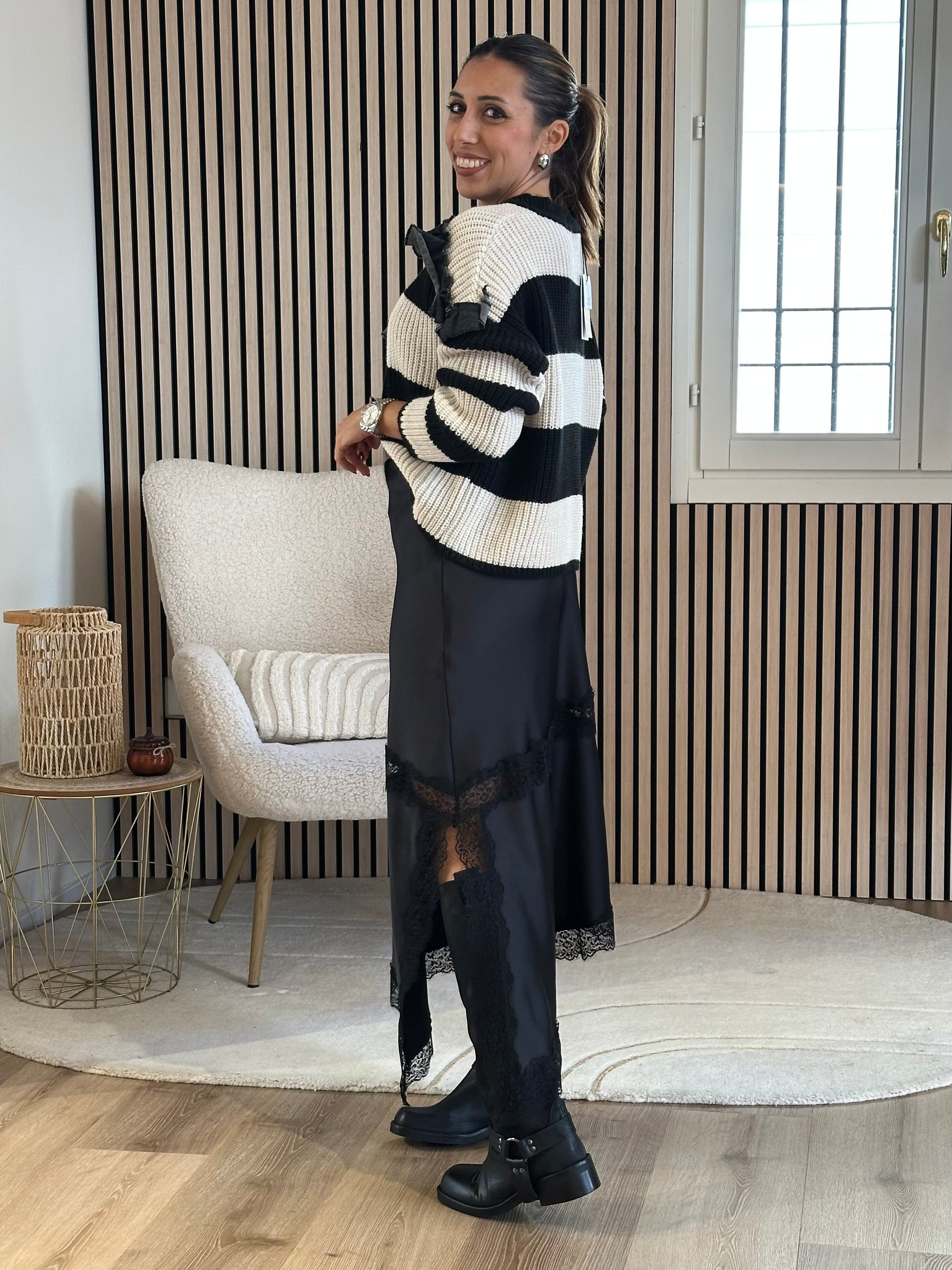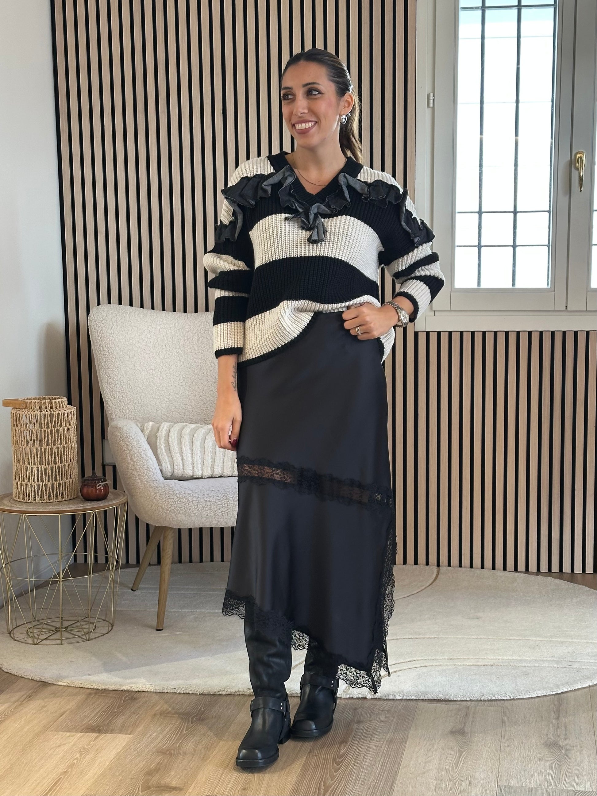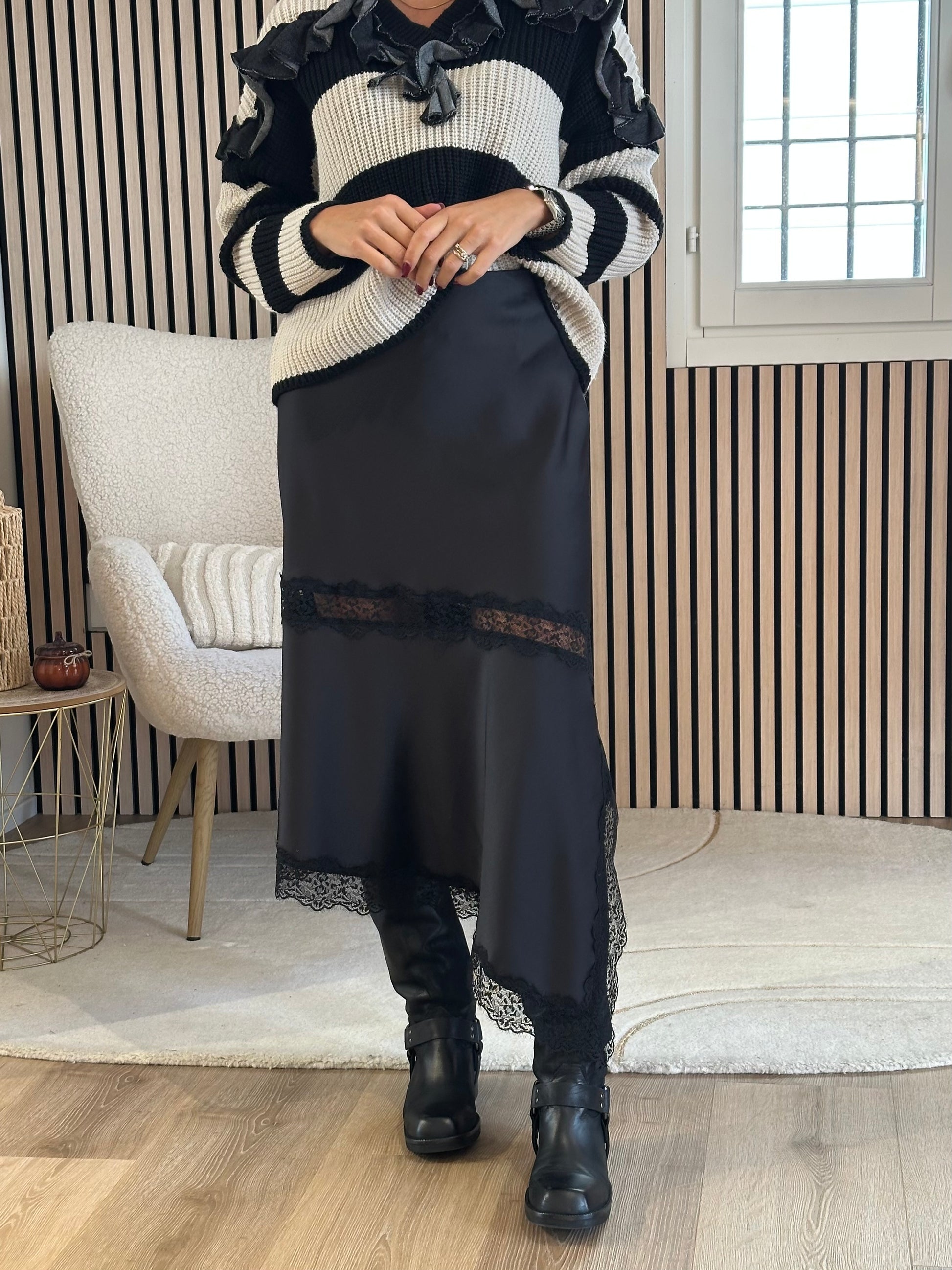 Gonna lunga in raso morbido con inserto di pizzo delicato sul fondo. Il tessuto scivola elegantemente sulla silhouette, creando un effetto sofisticato e femminile. La combinazione di raso e pizzo offre versatilità: indossabile sia per occasioni formali che per look più raffinati nel quotidiano. La lunghezza generosa garantisce una copertura elegante, mentre il pizzo aggiunge un tocco di sensualità senza compromessi sulla classe. Un capo essenziale per chi ricerca qualità e stile senza tempo.