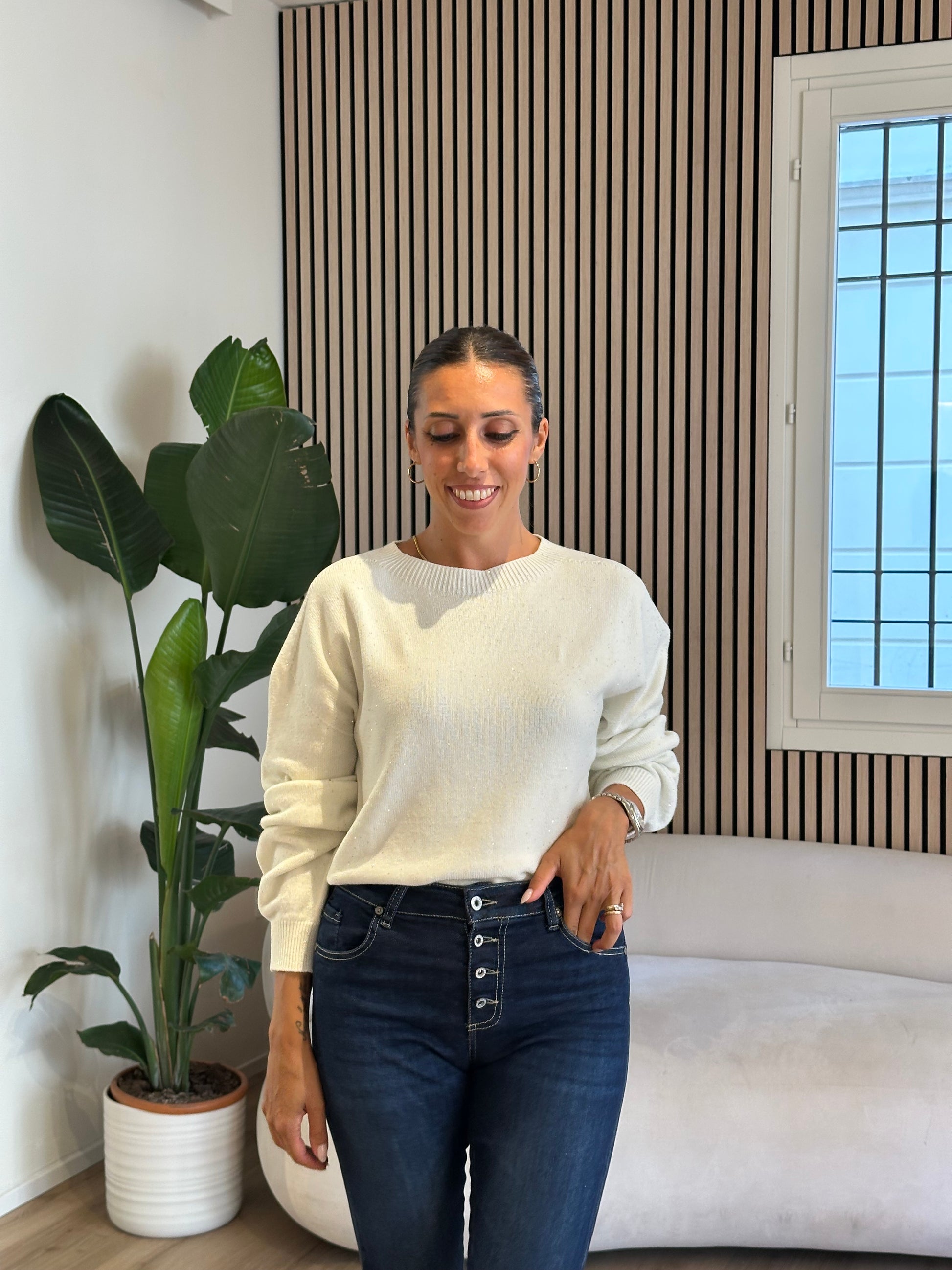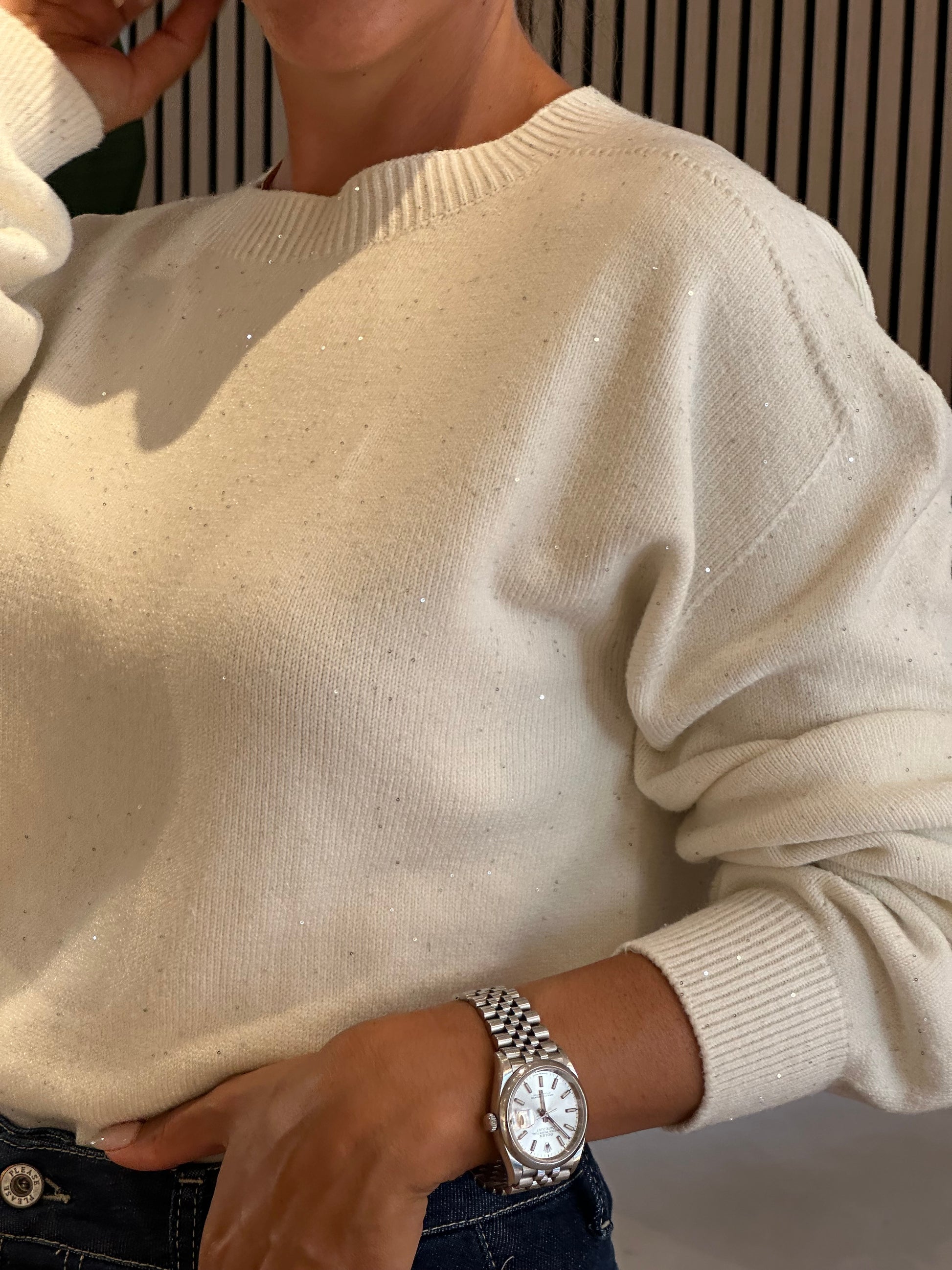 Questa maglia paricollo bianca è perfetta per ogni occasione grazie alla sua morbidezza e al tocco glamour dato dalle paillettes. Sia che tu voglia indossarla di giorno o di sera, non passerai sicuramente inosservata. Il tuo look sarà sempre elegante e fashion con questa maglia di alta qualità.