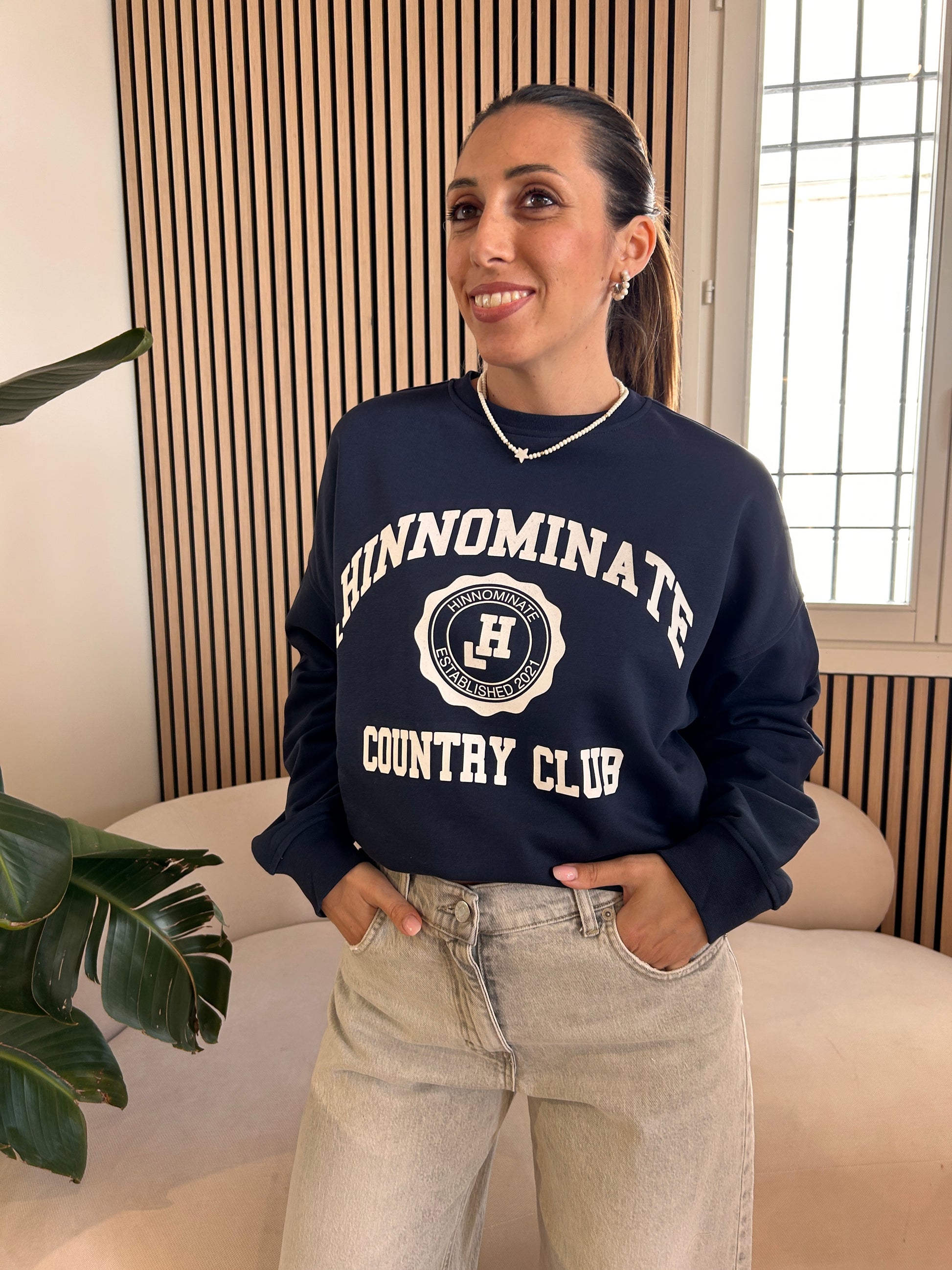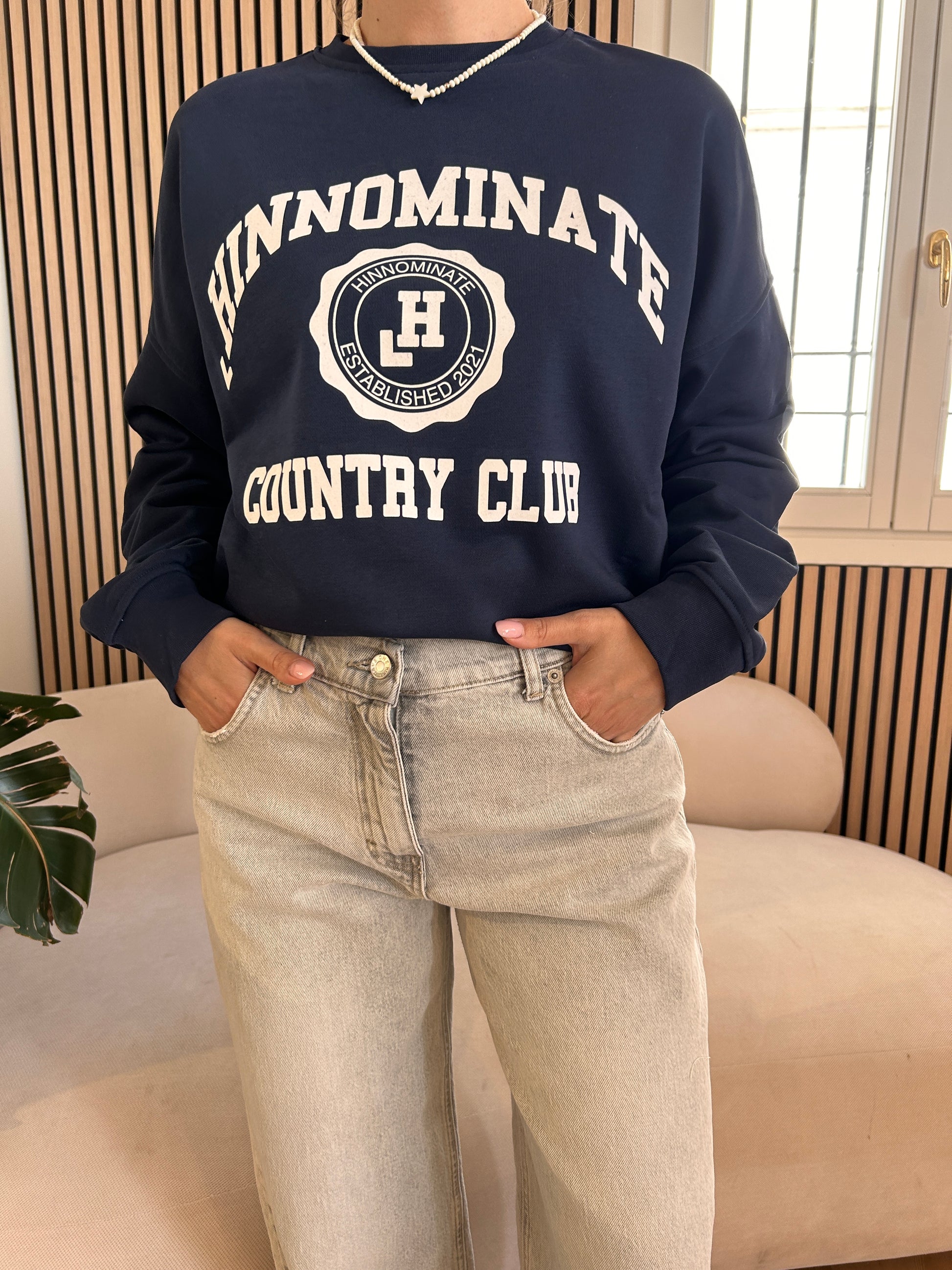 Felpa Paricollo Over di Hinnominate nel blu con scritta bianca.
