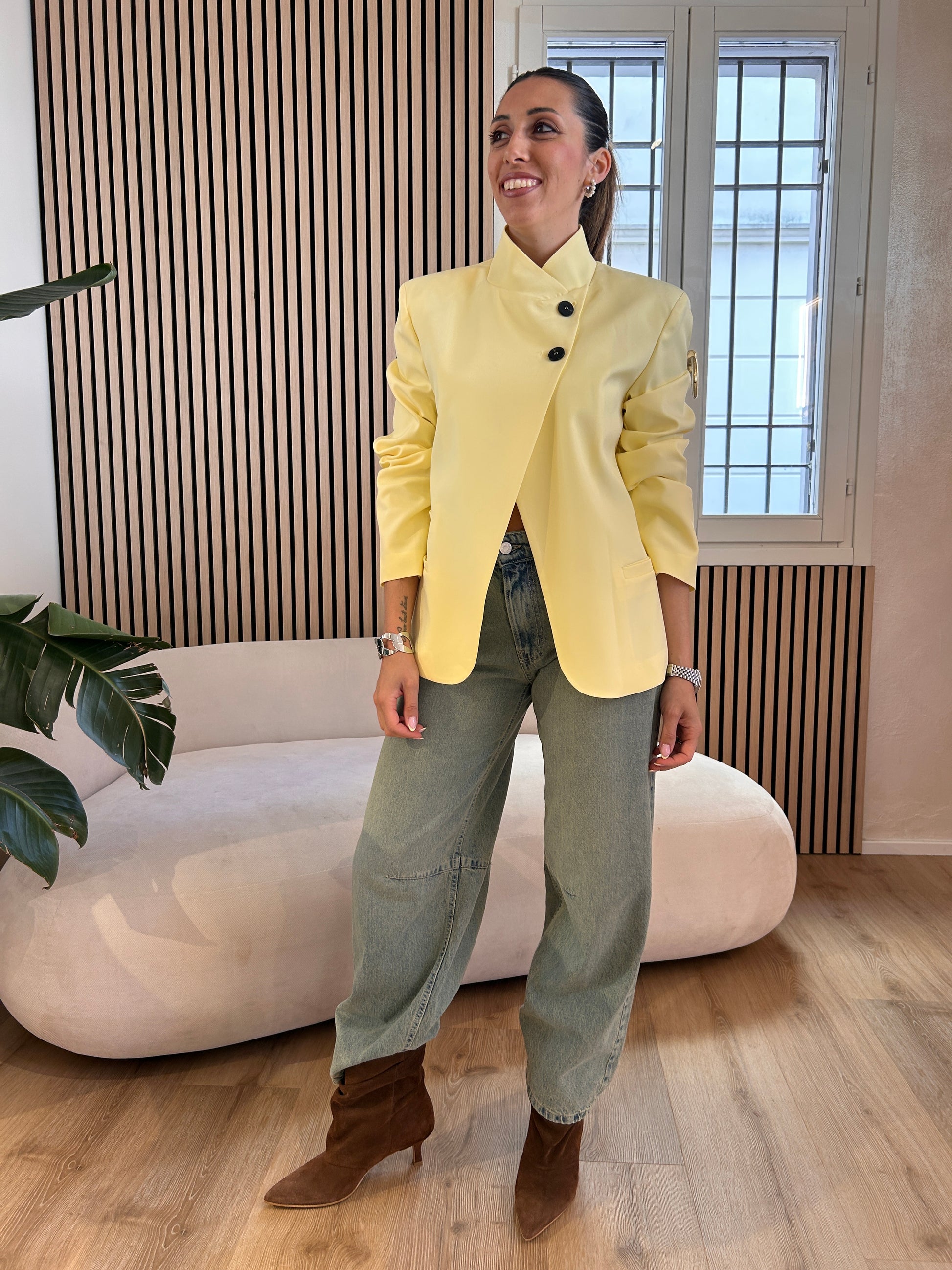 Giacca coreana di Haveone gialla con bottoni a contrasto neri, spalline imbottite foderata internamente, vestibilità giusta.