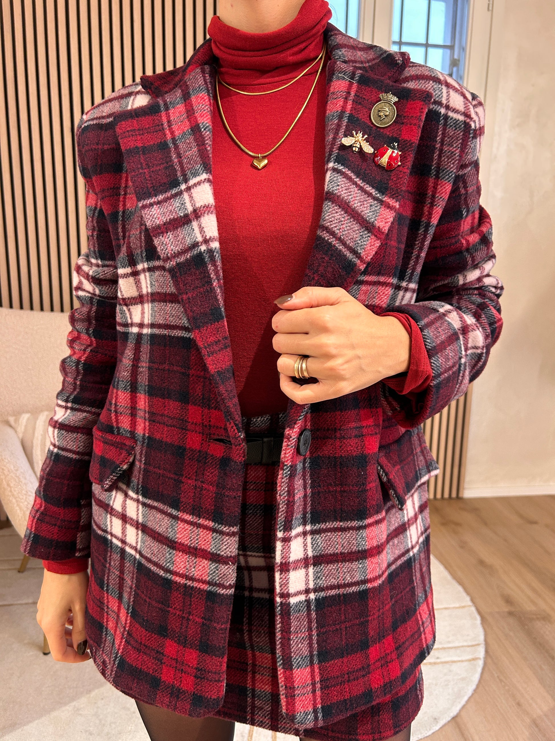 Giacca audace che sfida le convenzioni con un pattern fantasioso e dettagli di spille che catturano lo sguardo. Perfetta per chi osa distinguersi, questa giacca trasforma ogni outfit in una dichiarazione di stile personale.
