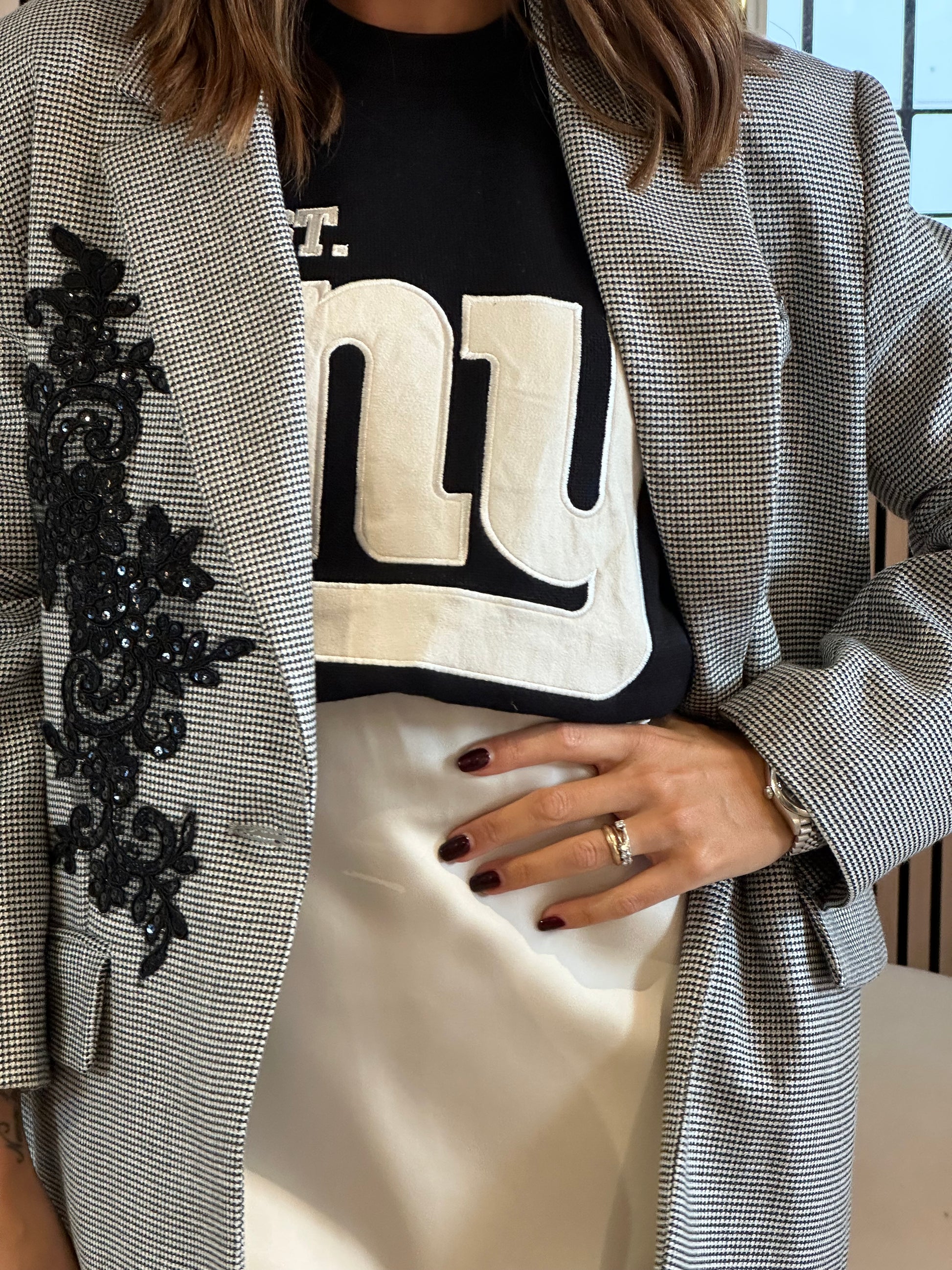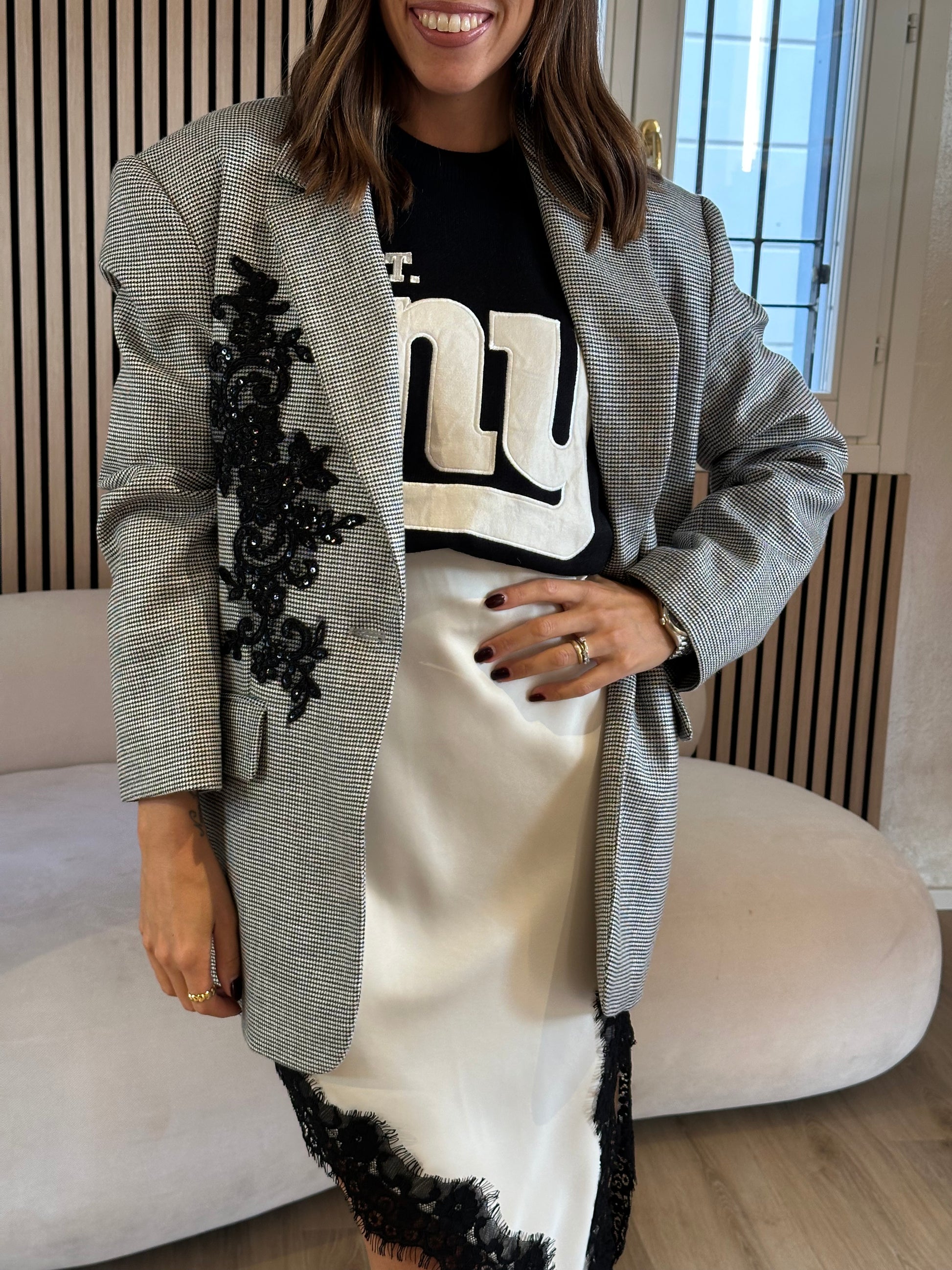Elegante e sofisticata, questa giacca pied de poule è impreziosita da delicate patch in pizzo e brillanti paillettes che aggiungono luce e carattere al tuo look.