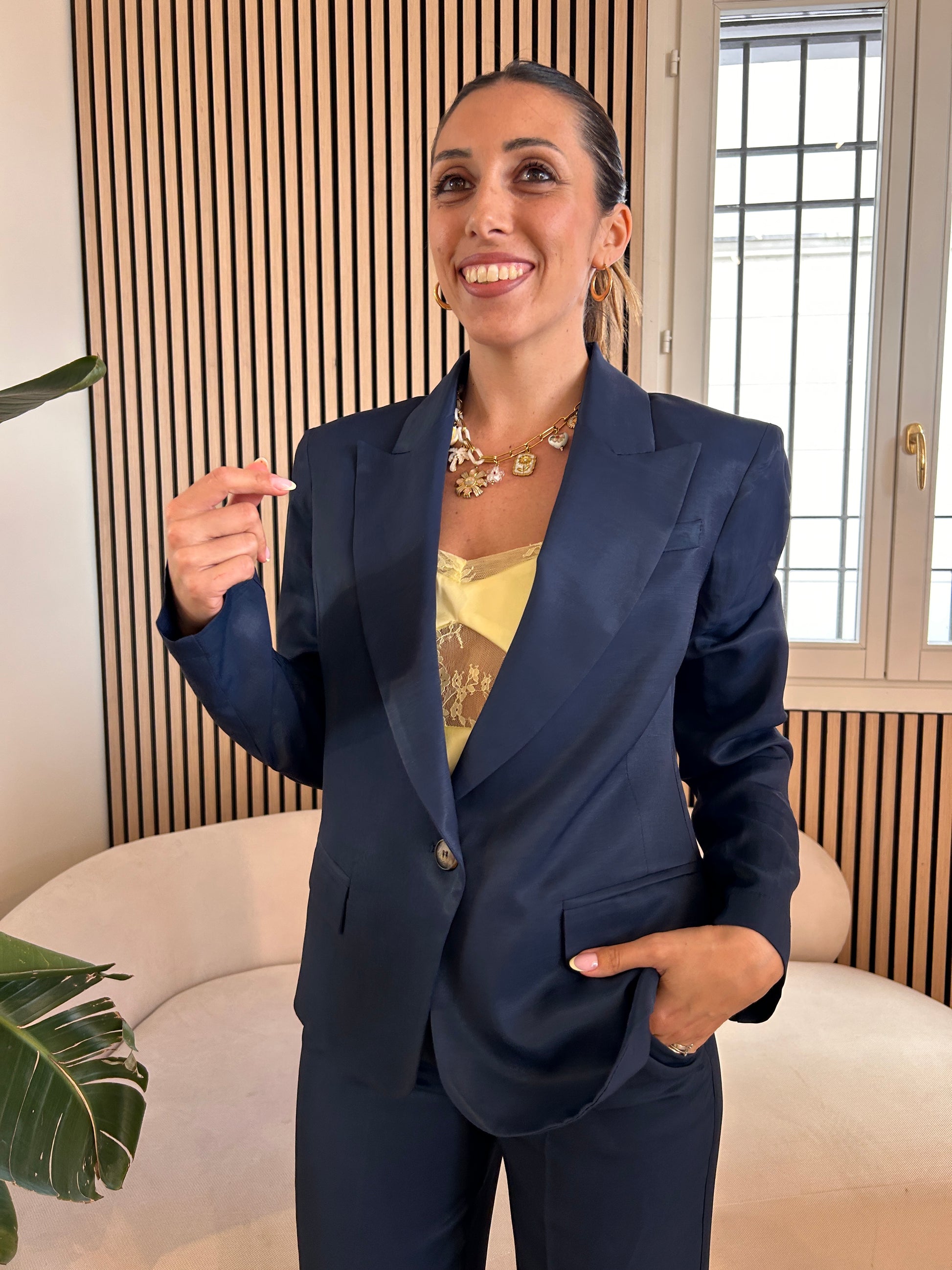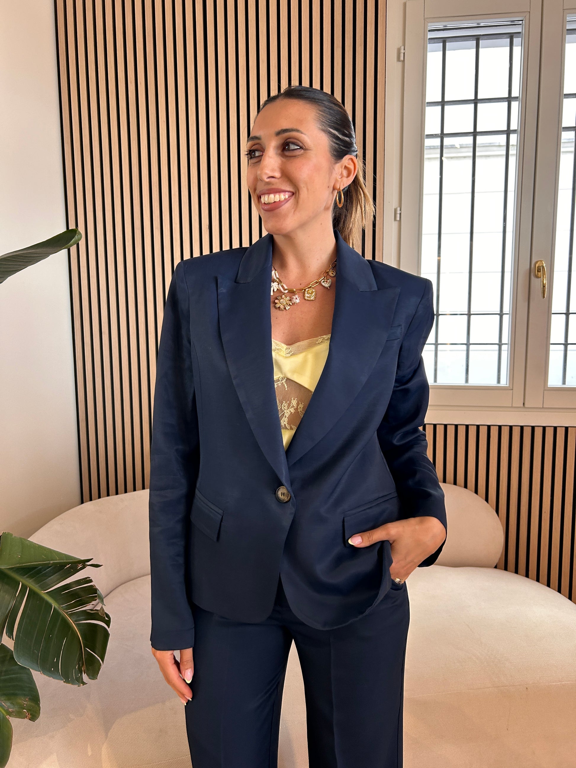 Giacca un bottone misto lino colore blu notte, modello a scatola chiusura monopetto effetto lucido, spallina imbottita. Due taschine finte sul davanti, leggermente sfiancata.