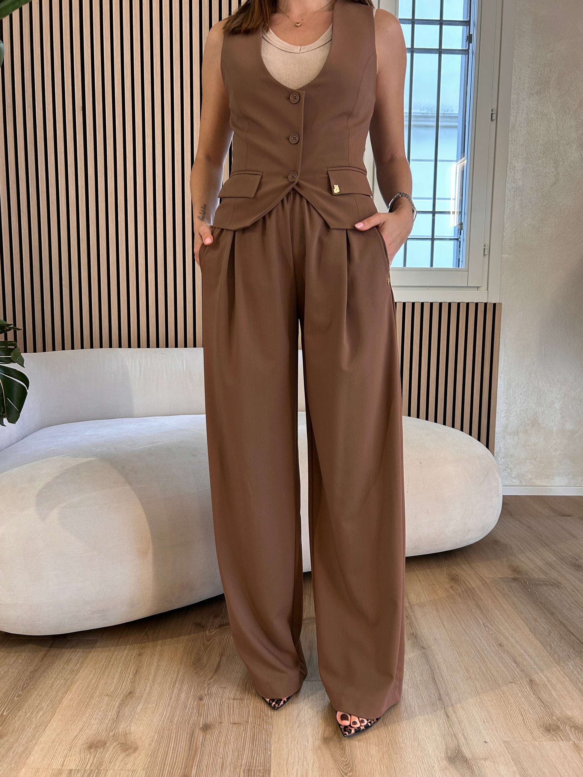 Gilet di Hinnominate, nel color moka. Scollatura profonda sul davanti con tre bottoni e taschine finte laterali. Vestibilità regolare dalla Xs alla M.