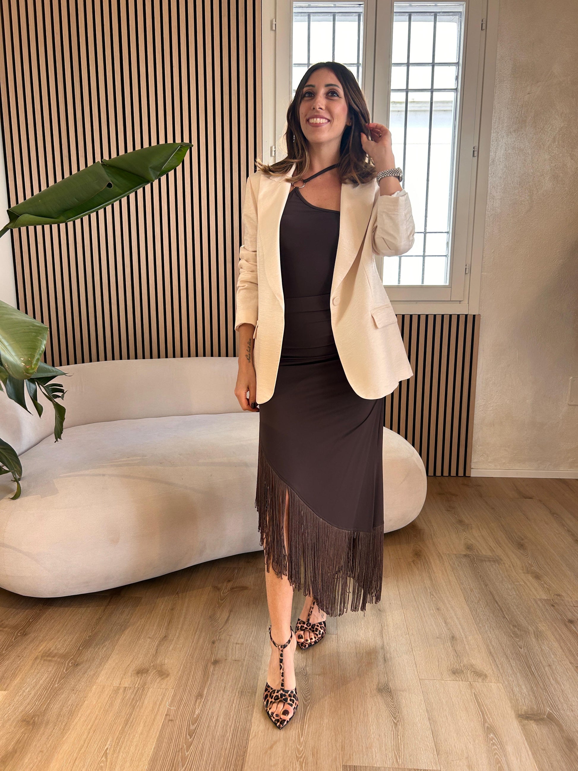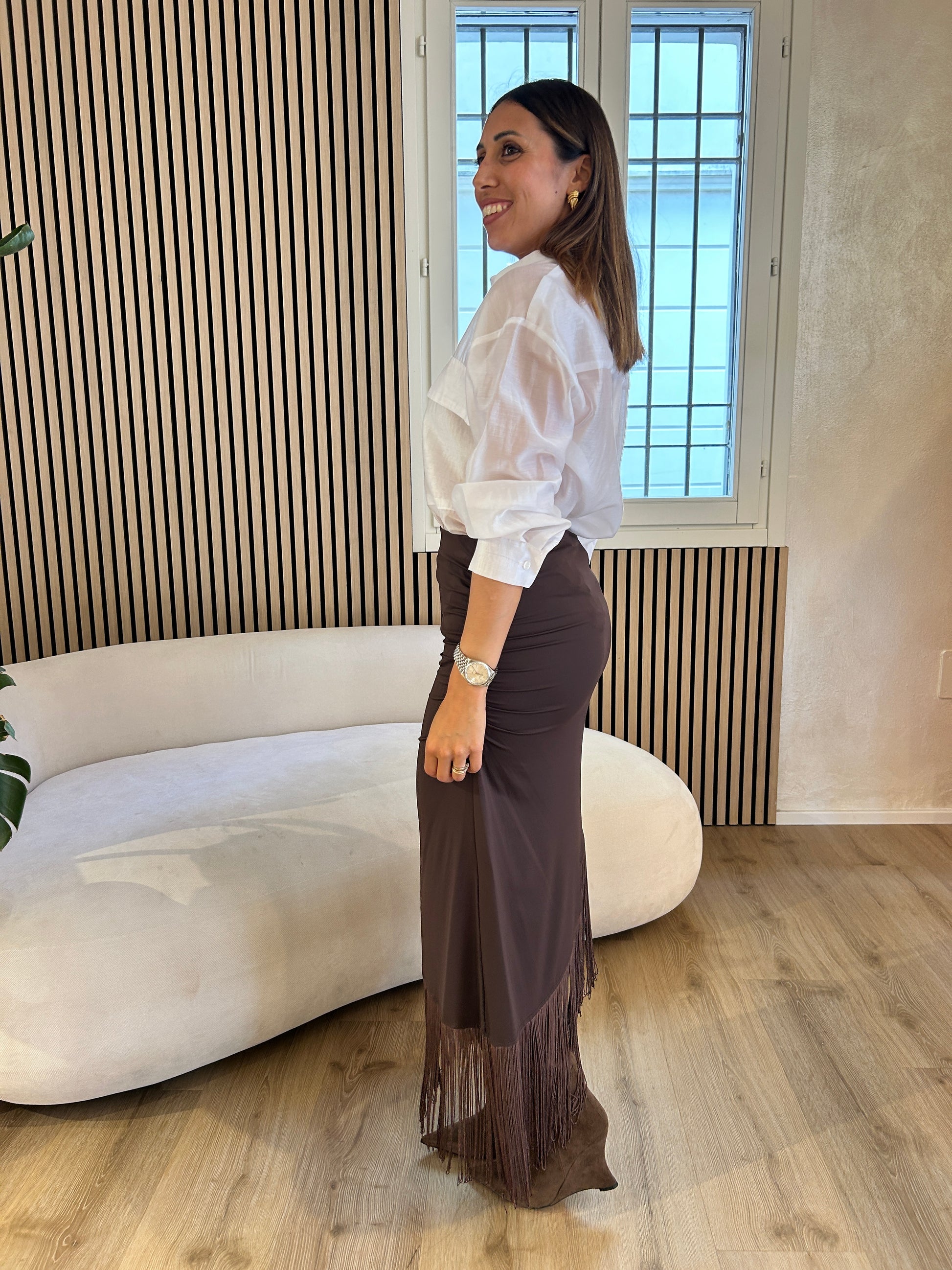 Gonna di Haveone, color moro. Elastico in vita, arricciatura laterale e frange sul finale. Vestibilità regolare dalla S alla M.
