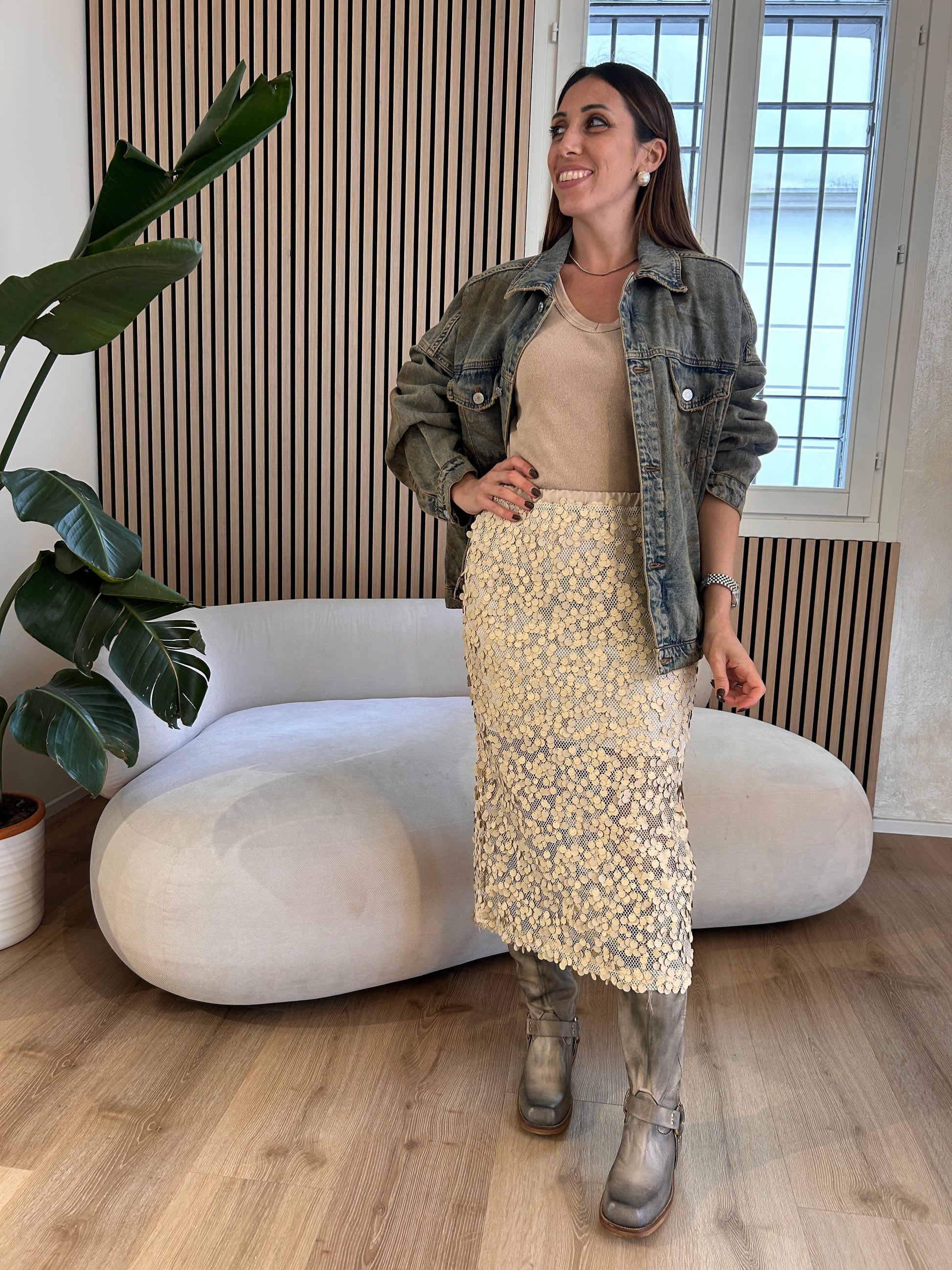 Gonna di Haveone, con paillettes nel color beige con sottoveste incorporata e spacco sul retro. Elastico in vita. Vestibilità regolare dalla S alla M.