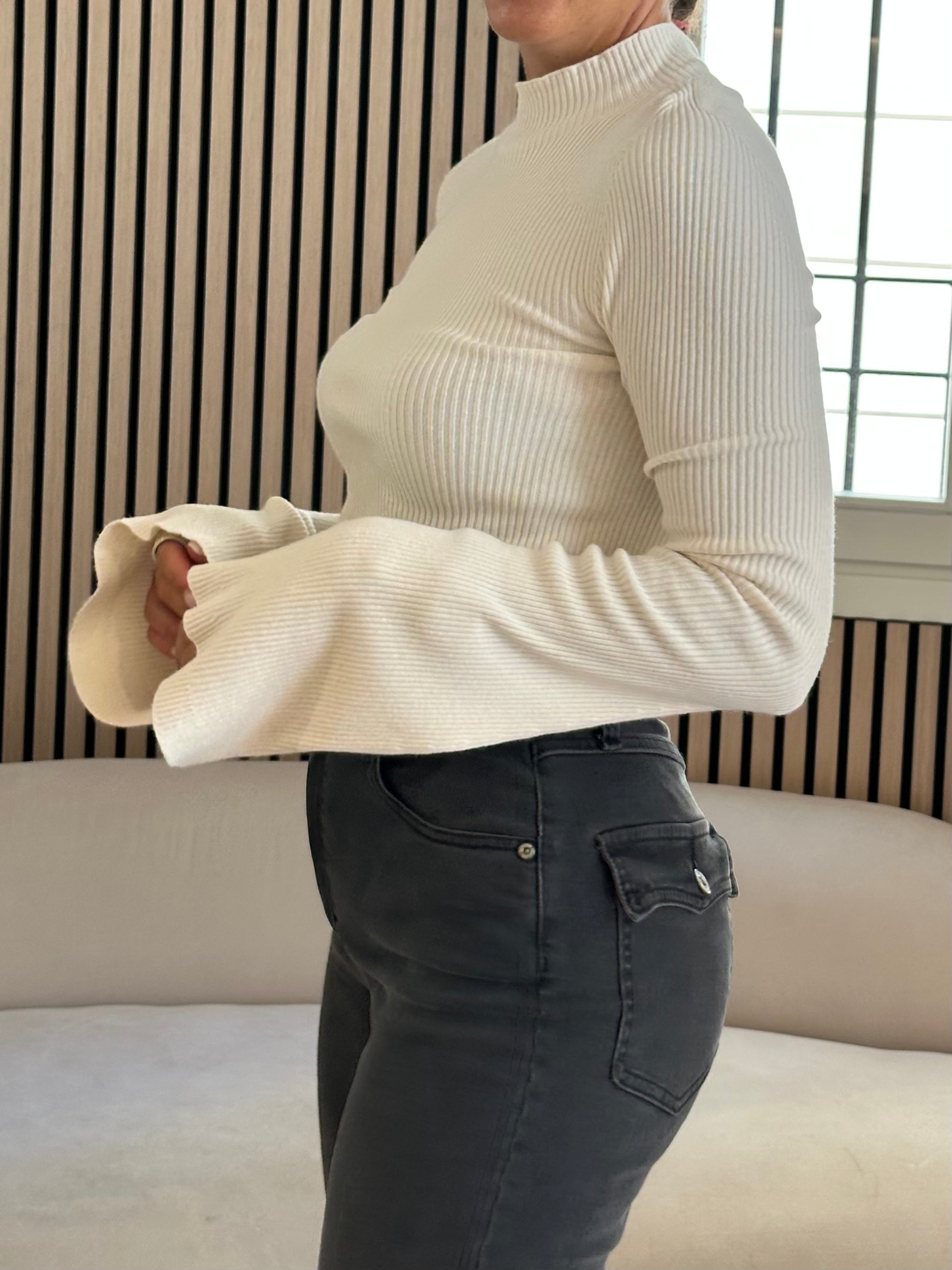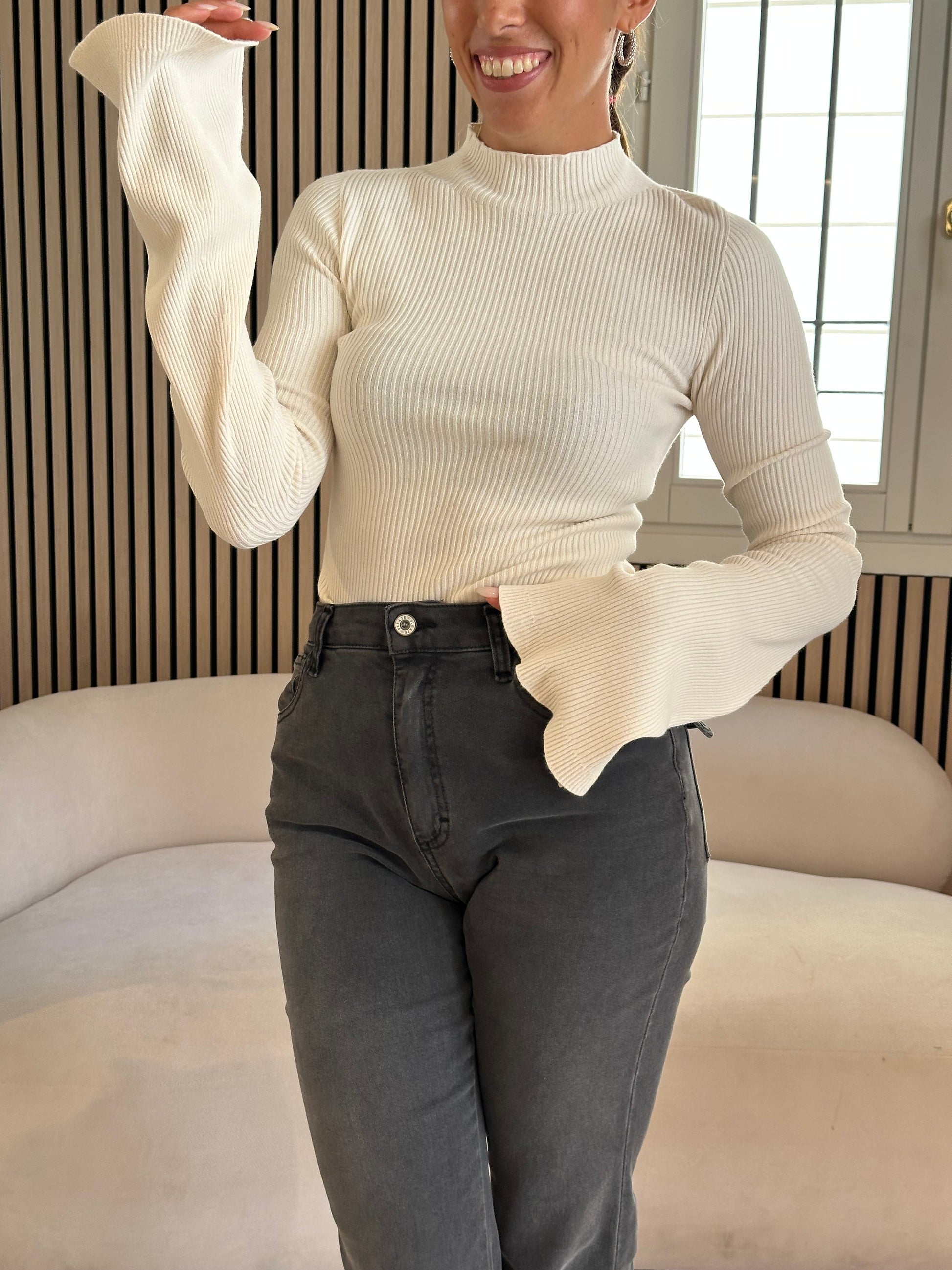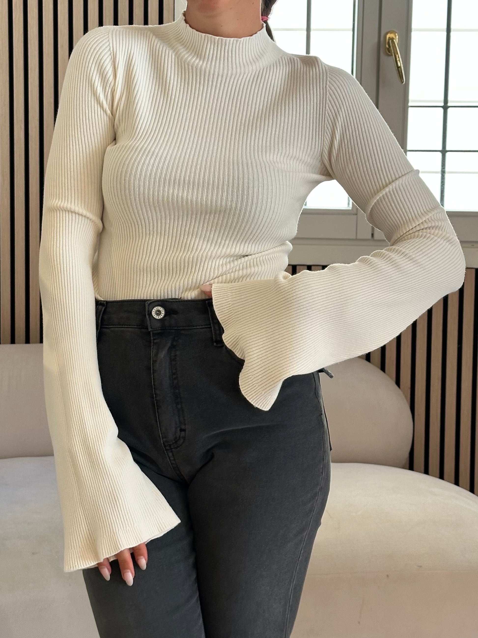 Il lupetto a coste con manica leggermente ampia in morbida viscosa di Kontatto unisce comfort e stile contemporaneo. La vestibilità ampia delle maniche offre un tocco di originalità e libertà nei movimenti, mentre il tessuto a coste valorizza ogni silhouette con eleganza naturale.