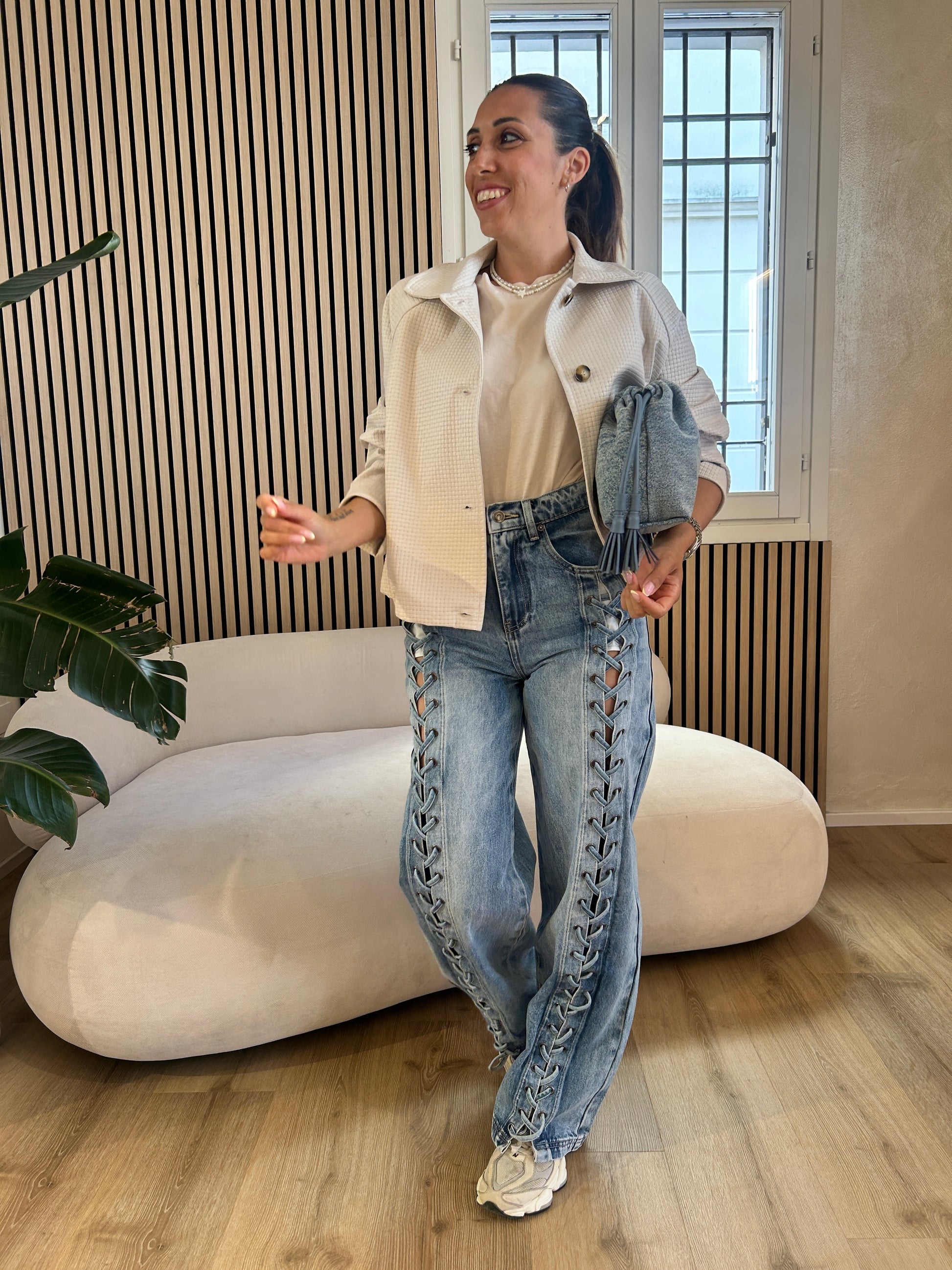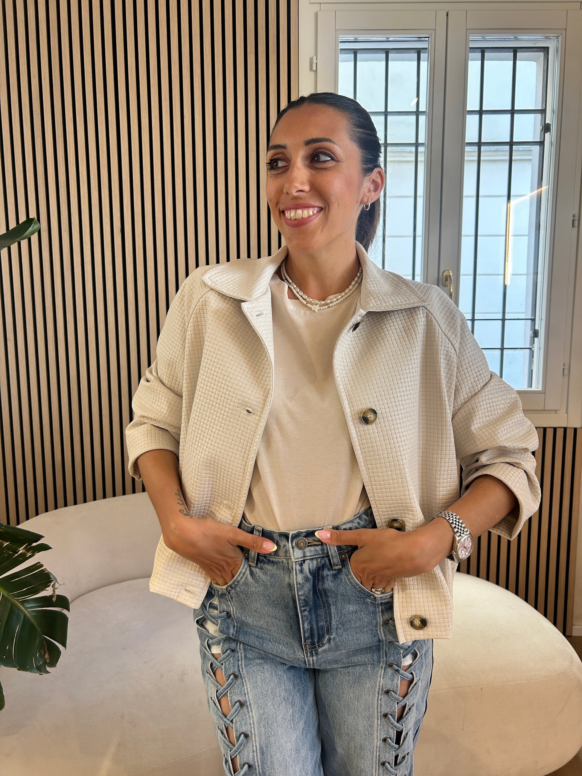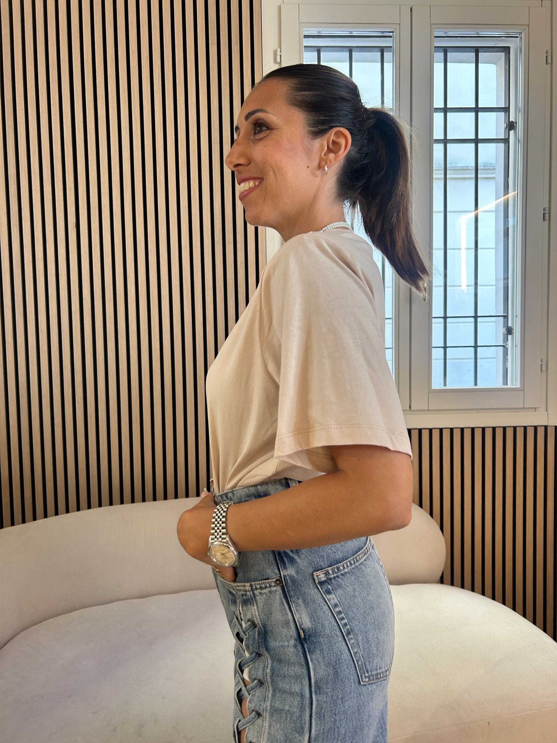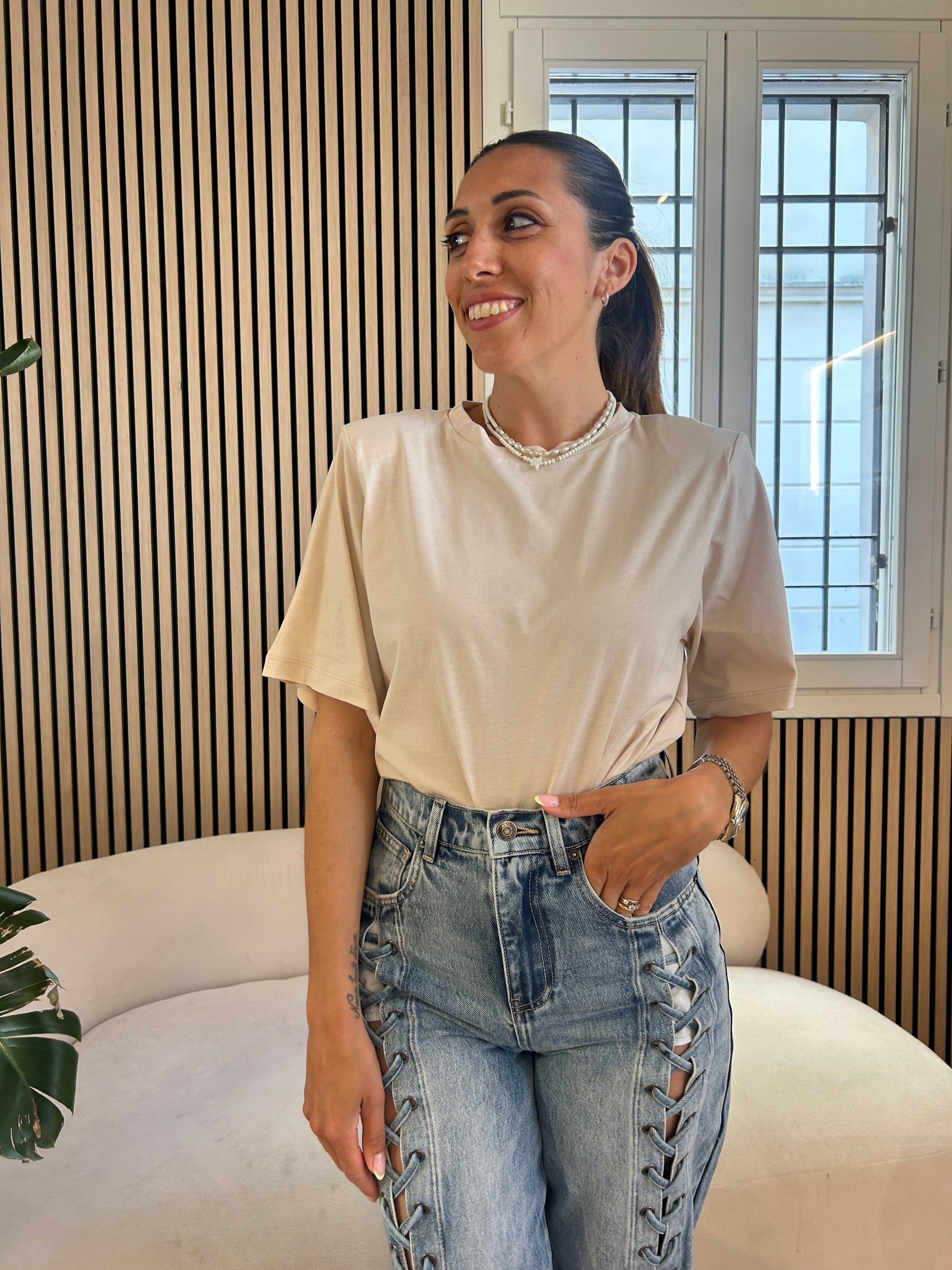 Maglia di Haveone a mezza manica, fatta a body con spalline imbottite nel beige.