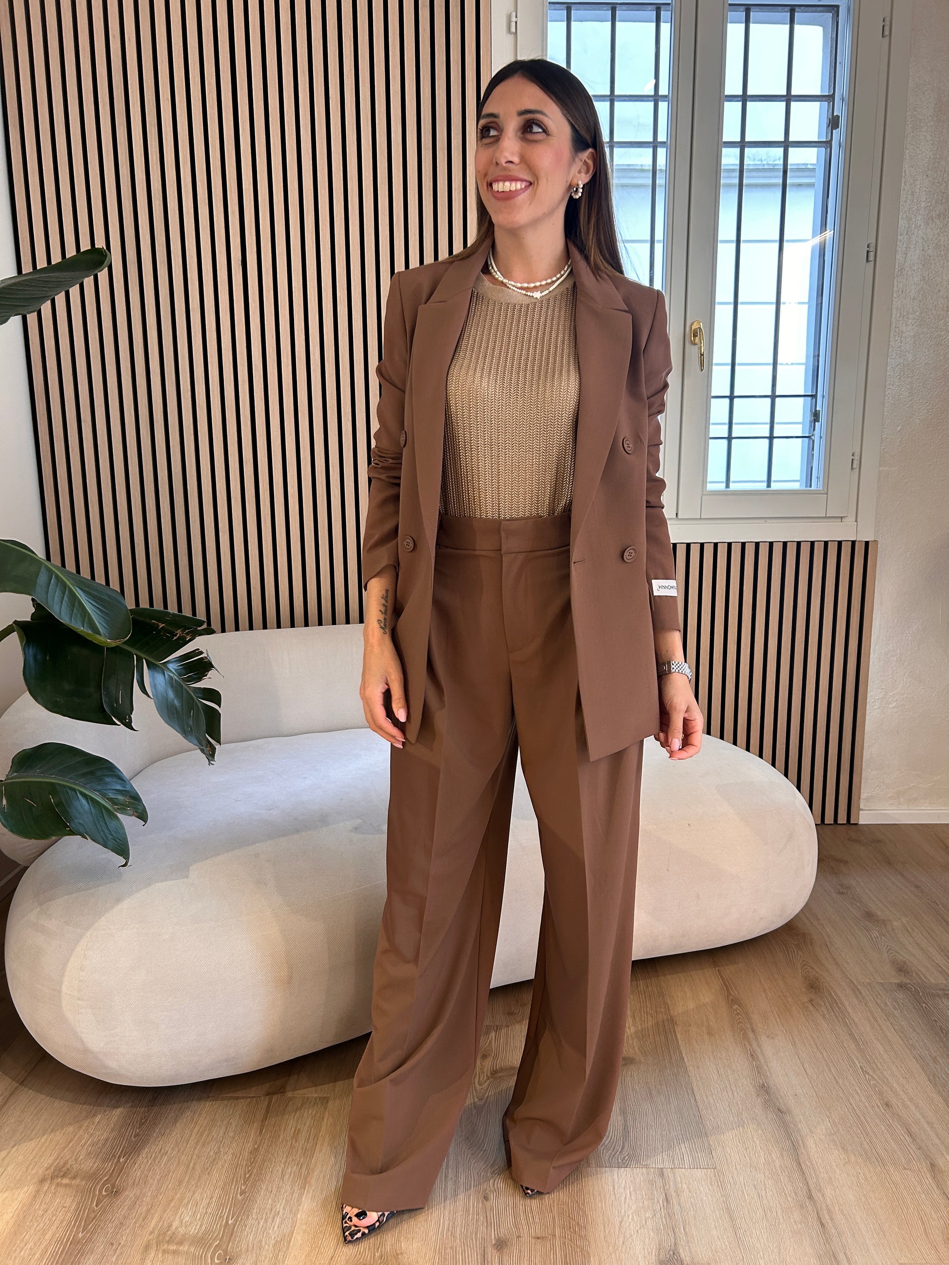 Pantalone over con pences colore moka di Hinnominate, modello vita alta con zip e gancetto, passanti per cintura e taschine a filetto con logo in metallo oro.