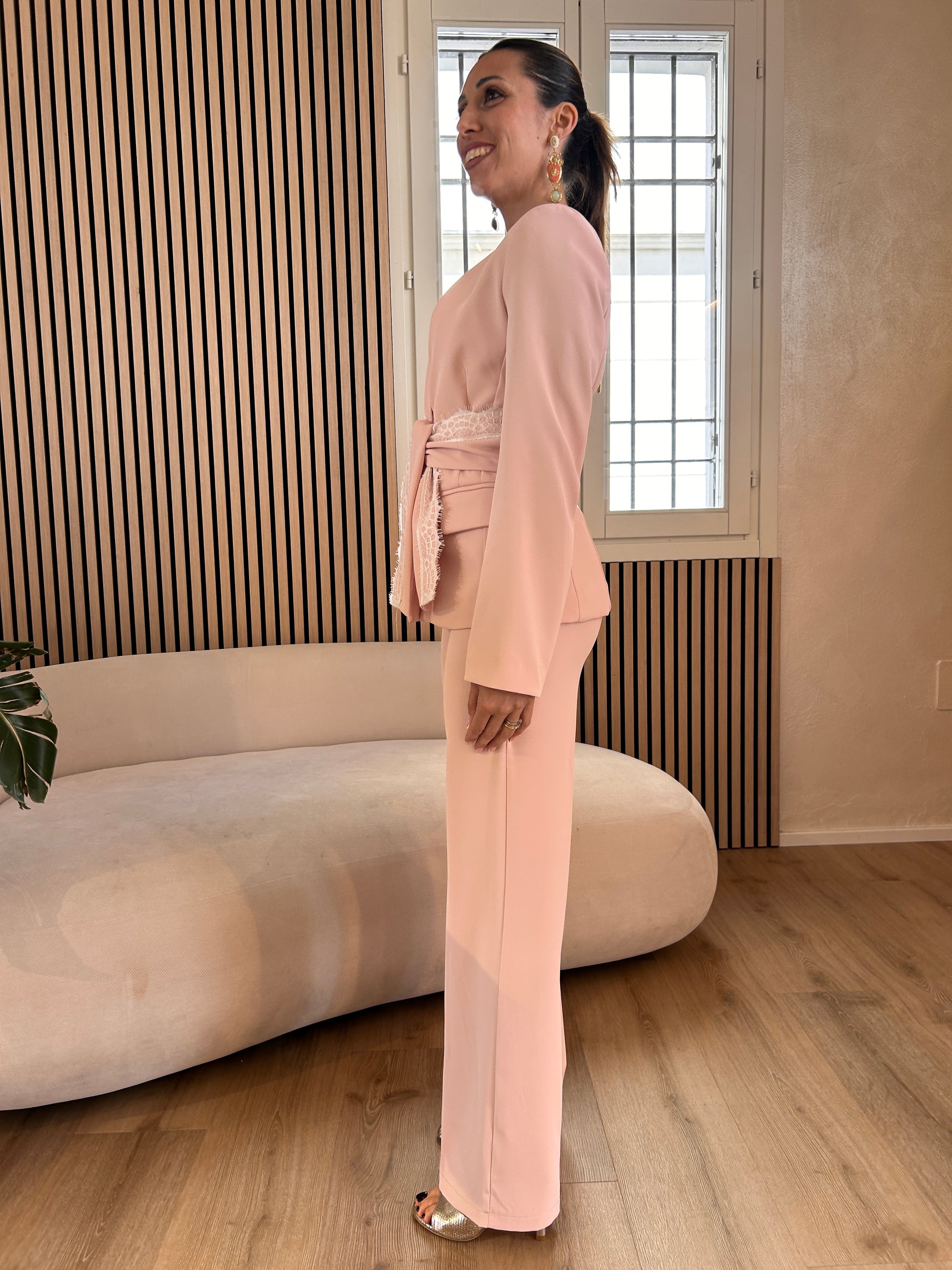 Pantalone rosa a palazzo di Haveone modello a vita alta con taschine a filetto zip centrale, passanti per cinta e bottone laterale.