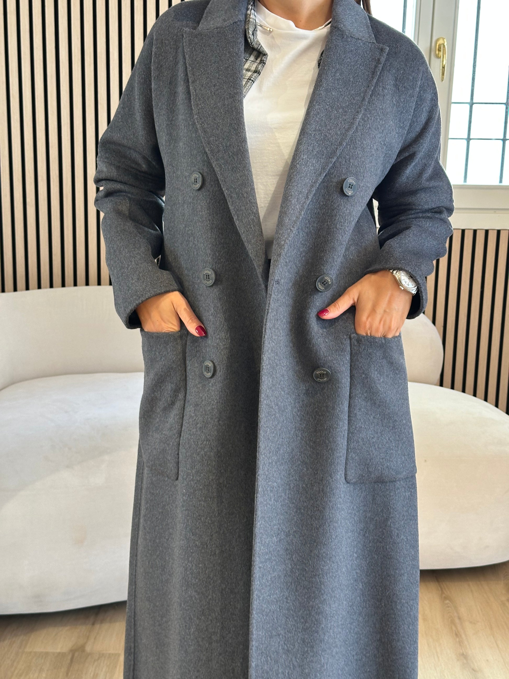 Questo cappotto doppiopetto è unico, realizzato a mano nel colore grigio che dona eleganza ed un tocco artigianale al tuo guardaroba.