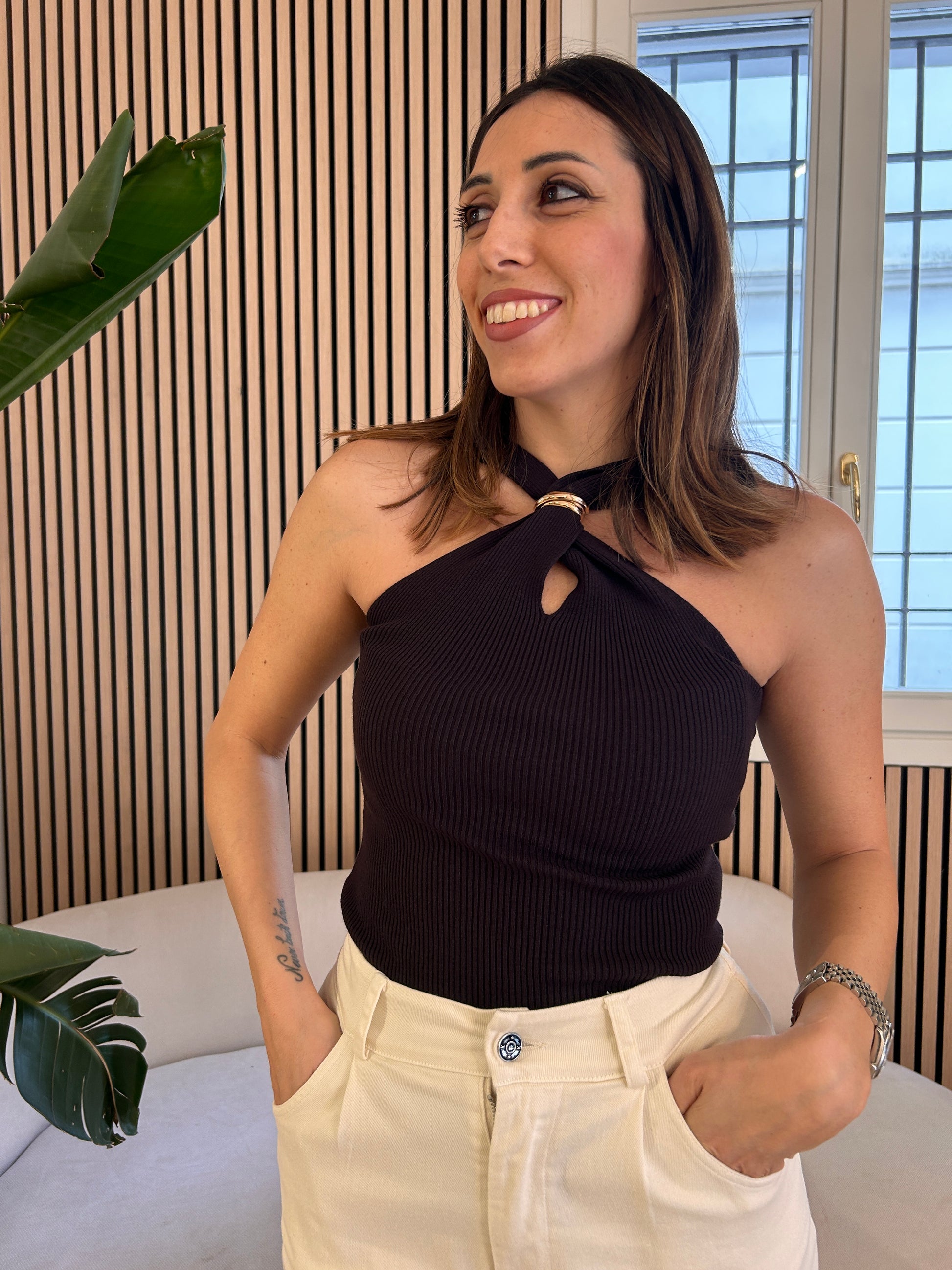 Top in costina con incrocio sul davanti con accessorio ,di Kontatto nel color cioccolato in taglia unica.